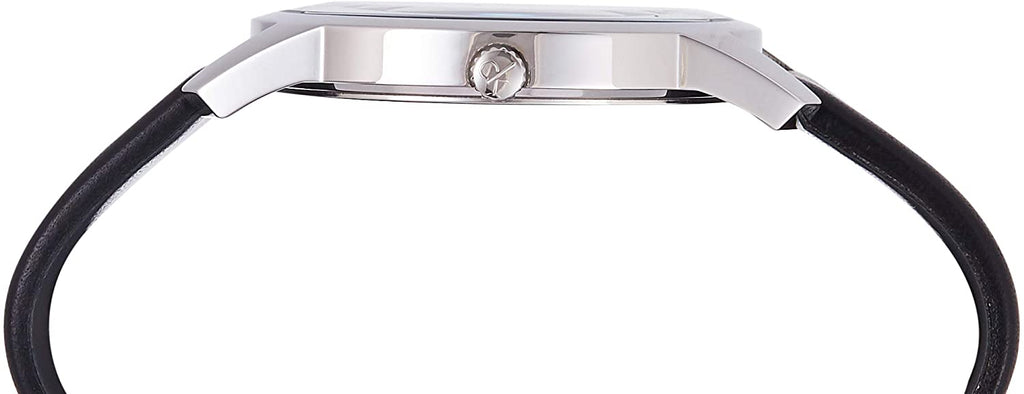 - dial: cool gray dial with silver-tone markers, two hands and logo