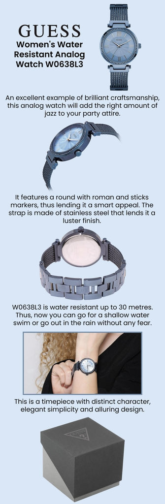 Guess W0638L3 is an incredible trendy Ladies watch from Soho collection. Case material is Stainless Steel while the dial colour is Blue. 30 metres water resistance will protect the watch and allows it to be worn in scenarios where it is likely to be splashed but not immersed in water. It can be worn while washing your hands and will be fine in rain. We ship it with an original box and a guarantee from the manufacturer.