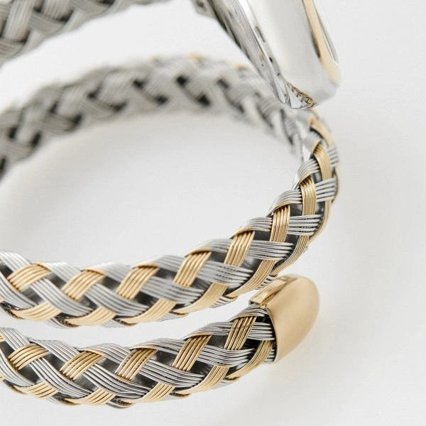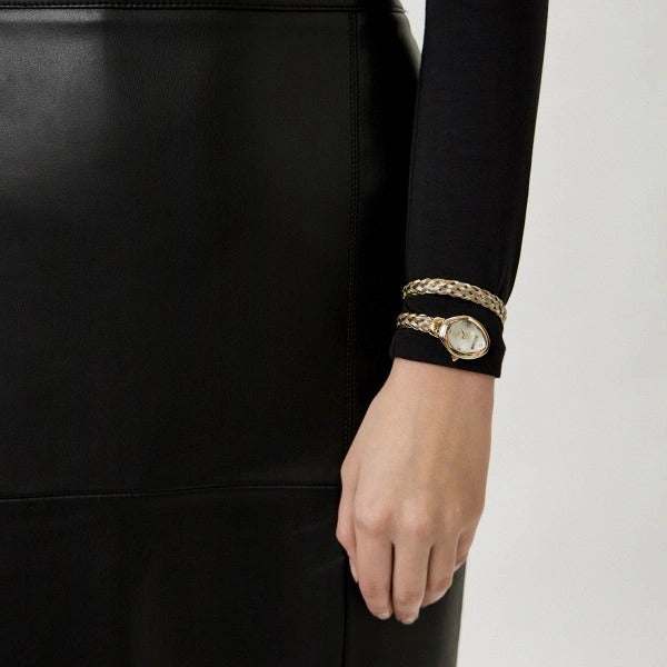 This premium brand watch with a quartz movement is shaped like a snake. The case is made of high-quality steel and encrusted with Swarovski crystals. Features include: scratch-resistant mineral glass; analog time display; hour and minute hands; no numerals; water resistance 30WR; steel bracelet.