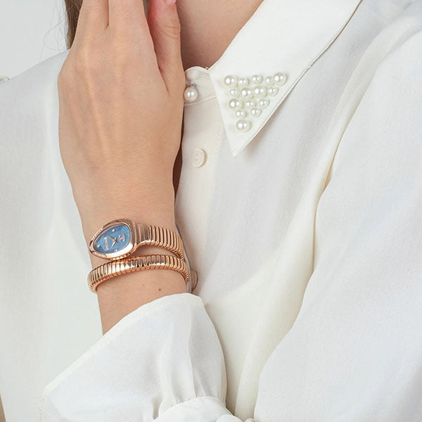 Elevate your style with the Just Cavalli Signature Snake Pearl Dial Ladies Watch. This stunning watch is not just a timepiece, but a statement piece. The sleek Pearl dial and signature snake design add a touch of luxury to any outfit. Make a bold and confident statement with this watch on your wrist.