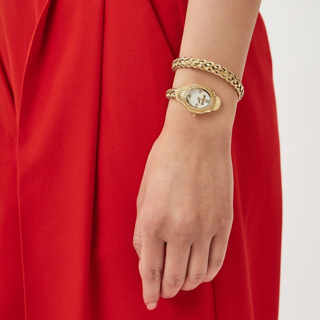 The watch is made of 316L stainless steel. Features include a quartz movement, a dial adorned with crystals and the brand logo, mineral glass, 3 ATM water resistance, a knurled crown, and a snake-shaped bracelet.