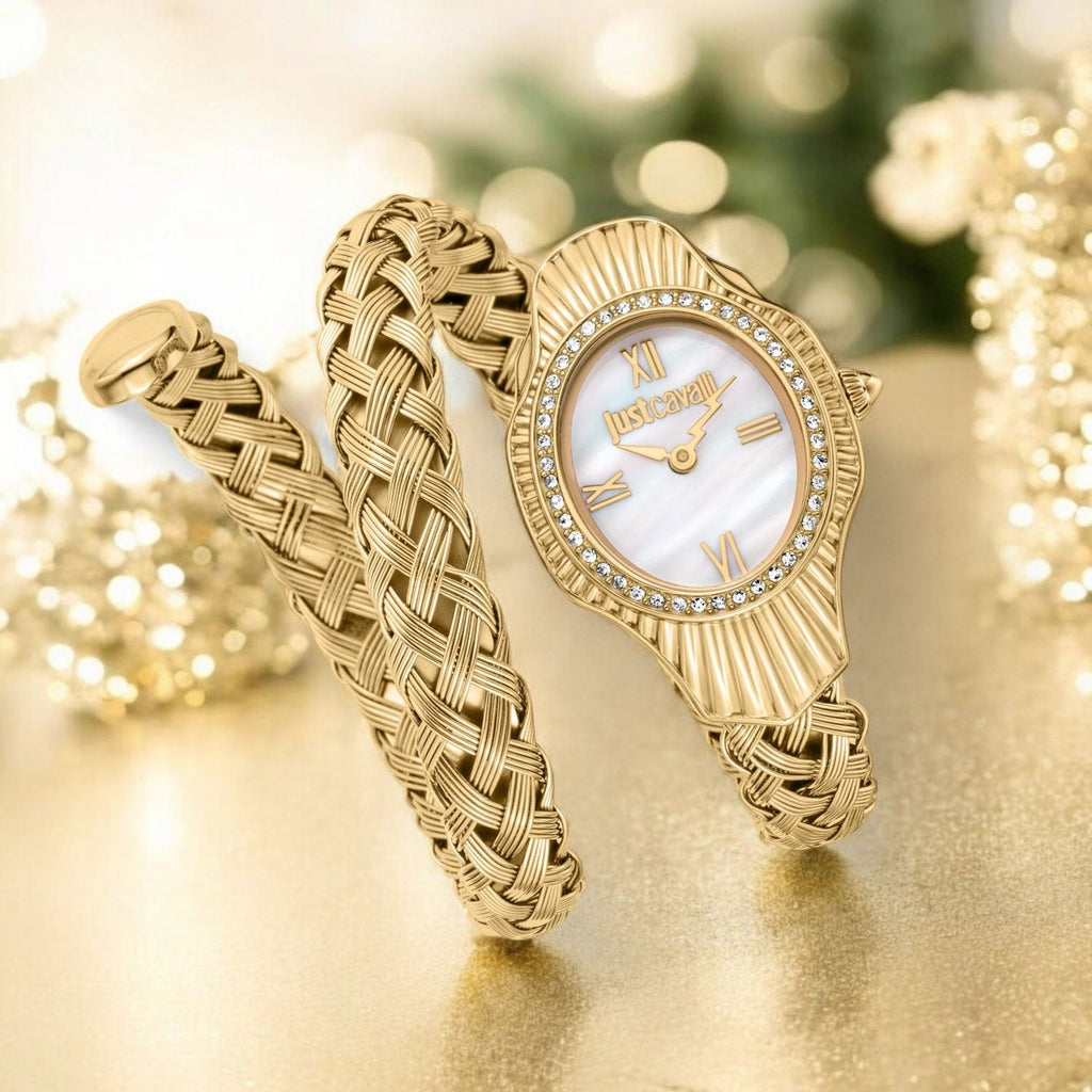Just Cavalli Twined Mother of Pearl Dial Gold Steel Strap Watch for Women - JC1L305M0025