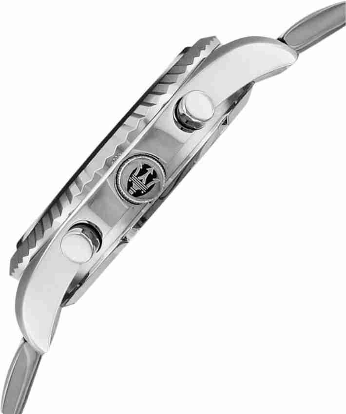 The refined men's chronograph with the Japanese Myota quartz movement. The case is made of silver stainless steel measuring 40 mm in diameter with a thickness of 11 mm. The case back is in polished stainless steel with a screw closure. The dial is black with silver-toned stick hour markers and hands. The bracelet in polished silver stainless steel with the push button safety clasp. The anti-reflection mineral glass resistant to shocks and scratches. Water resistant 10 atmospheres 100 meters. International Warranty 02 years. Swiss made - Maserati Competition Collection R8853100012
