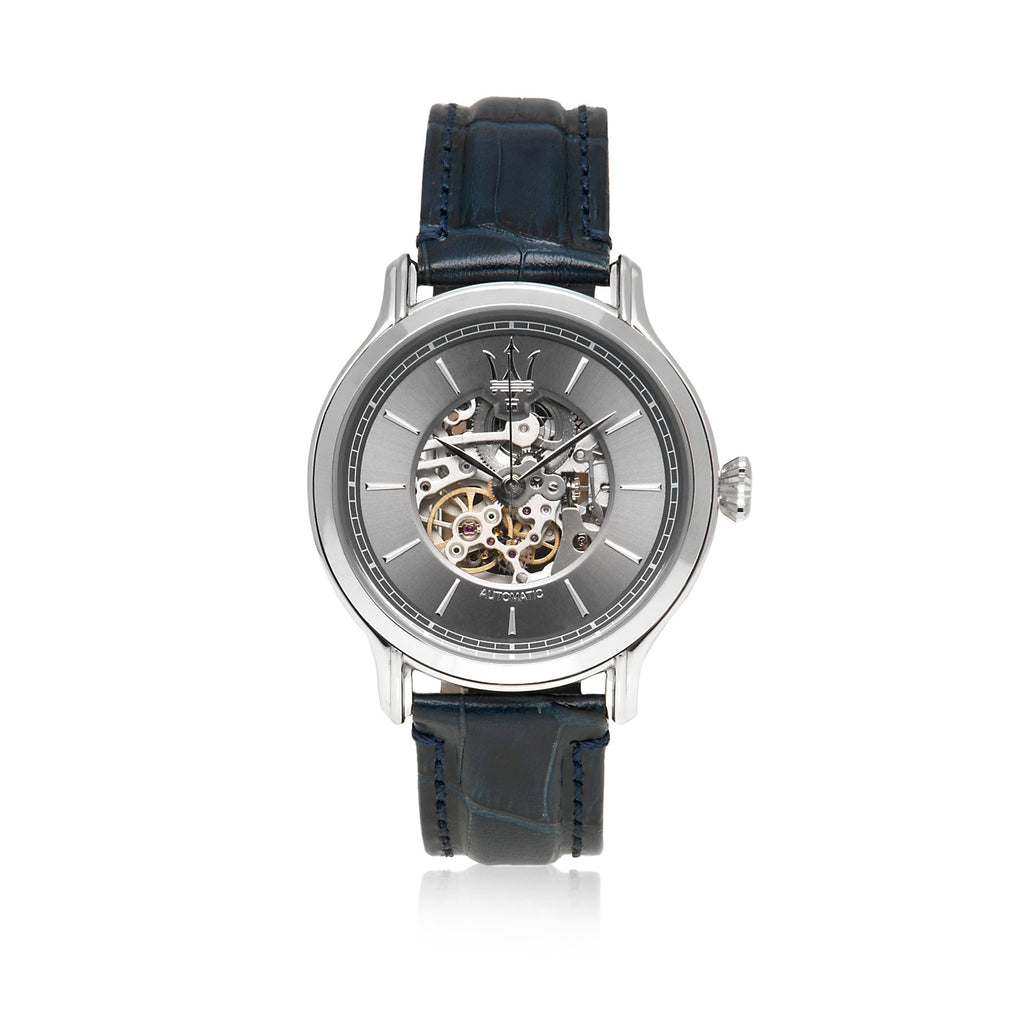 Stainless steel case with a blue leather strap. Fixed stainless steel bezel. Grey (skeleton center) dial with silver-tone hands and index hour markers. Minute markers around the outer rim. Dial Type: Analog. Automatic movement. Scratch resistant mineral crystal. Screw down crown. Transparent case back. Round case shape. Case size: 42 mm. Case thickness: 13 mm. Band width: 21 mm. Tang clasp. Water resistant at 100 meters / 330 feet. Casual watch style. Maserati Epoca Automatic Skeleton Dial Men's Watch R8821118002.