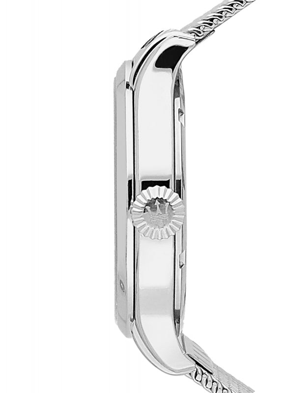 Stainless steel case with a stainless steel mesh bracelet. Fixed stainless steel bezel. Grey dial with silver-tone hands and index hour markers. Dial Type: Analog. Date display above the 6 o'clock position. SII caliber VJ42 quartz movement. Scratch resistant mineral crystal. Screw down crown. Solid case back. Round case shape.