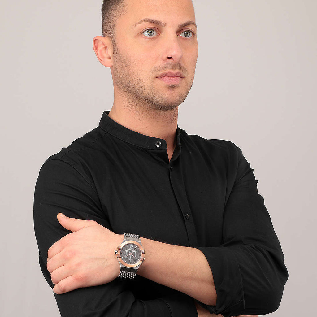 Stainless steel case with a stainless steel mesh bracelet. Fixed rose gold-plated bezel. Dark grey (maserati logo) dial with luminous rose gold-tone hands and index hour markers. Minute markers around the outer rim. Dial Type: Analog. Luminescent hands and markers. Date display at the 6 o'clock position. Quartz movement. Scratch resistant mineral crystal. Pull / push crown. Screwed case back. Round case shape. Case size: 42 mm. Case thickness: 10.7 mm. Band width: 24 mm. Milanese clasp. Water resistant at 100 meters / 330 feet. Functions: date, hour, minute, second. Potenza Series. Casual watch style. Maserati Potenza Quartz Dark Grey Dial Men's Watch R8853108007.