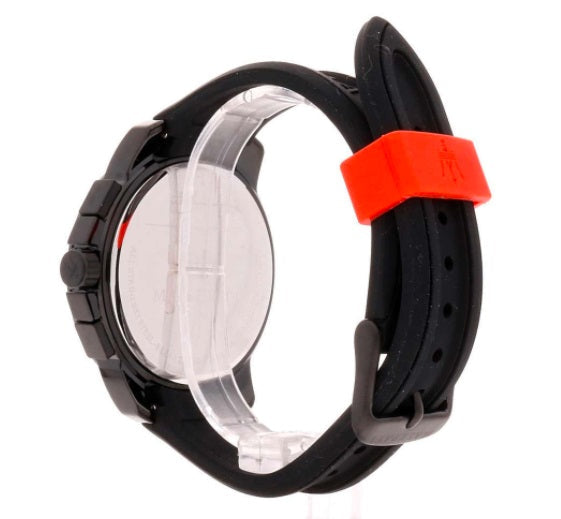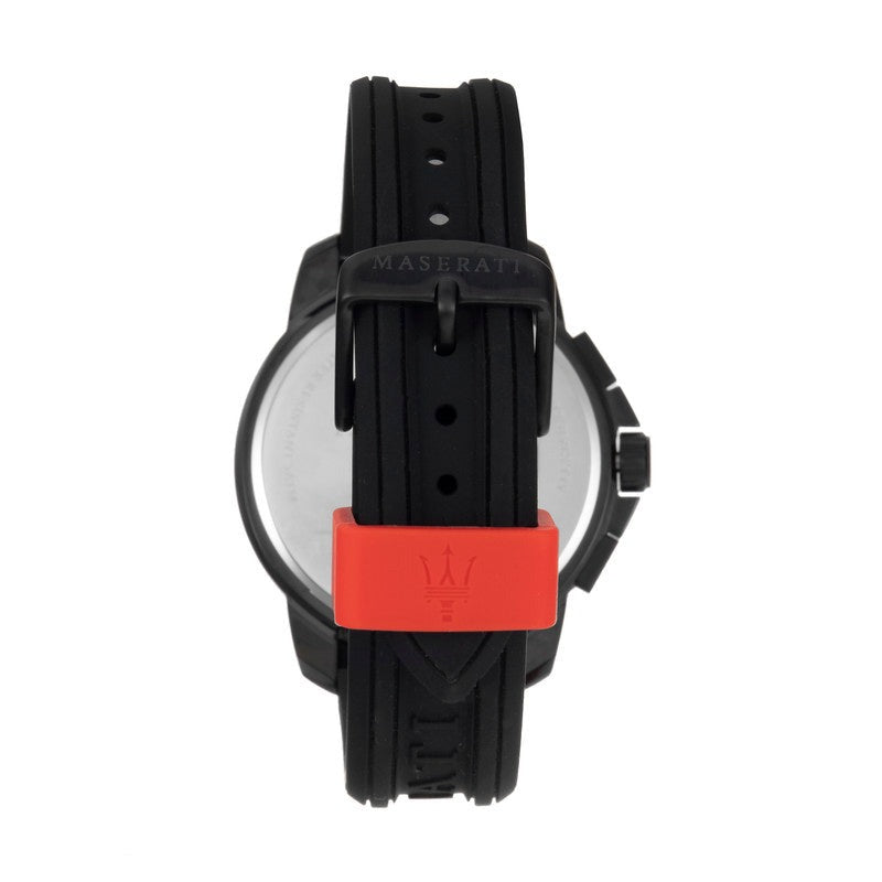 Silver-tone stainless steel case with a black rubber strap. Fixed black stainless steel bezel. Black dial with silver-tone hands and index hour markers. Minute markers around the outer rim. Dial Type: Analog. Chronograph - three sub-dials displaying: 60 second, 12 hour, 24 hour. Quartz movement. Scratch resistant mineral crystal. Pull / push crown. Round case shape. Case size: 44 mm. Water resistant at 50 meters / 165 feet. Functions: chronograph, hour, minute, second. Sport watch style. Maserati Sfida Chronograph Black Dial Men's Watch R8851123007.