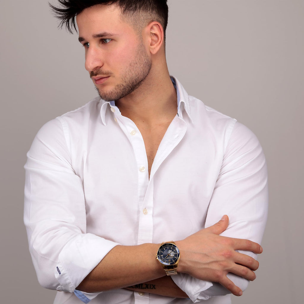 The wristwatch has a gold case, made of stainless steel, which looks like a real eye-catcher thanks to the matted, polished surface.