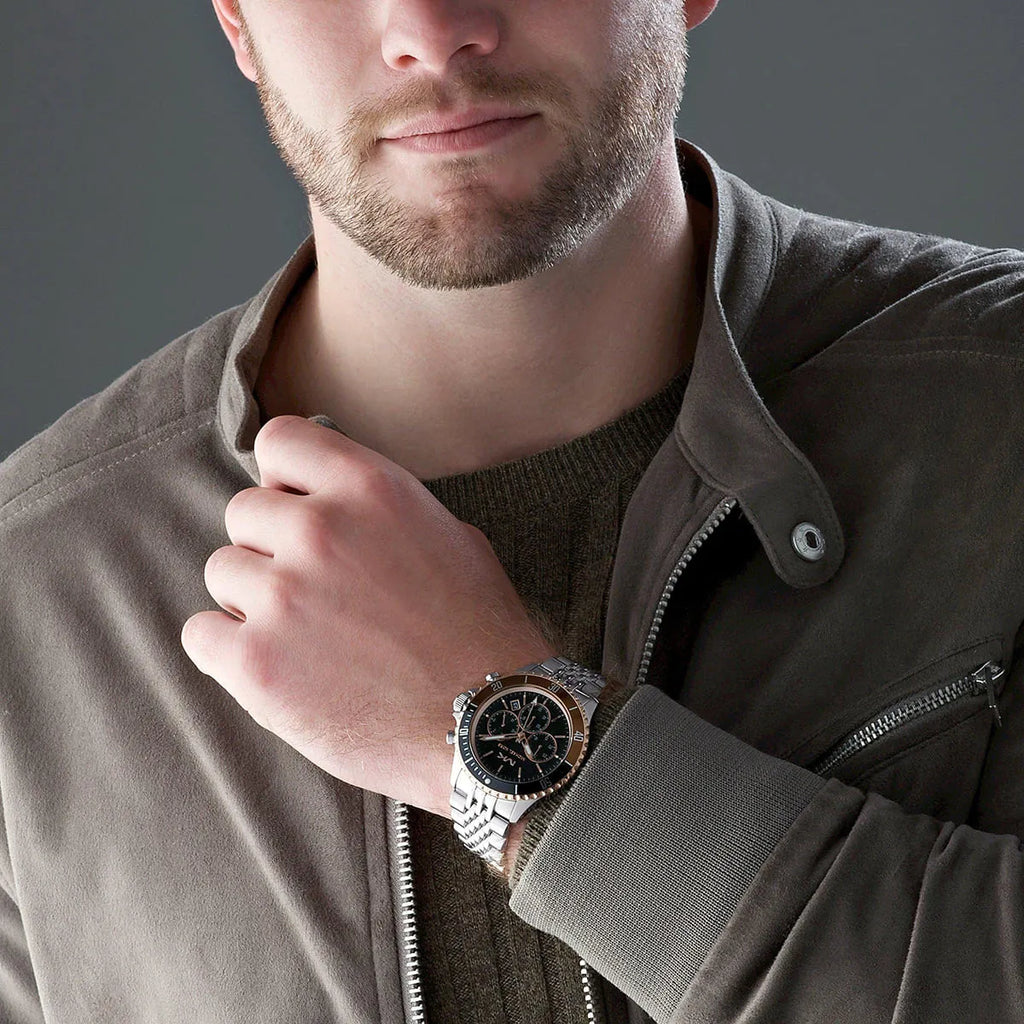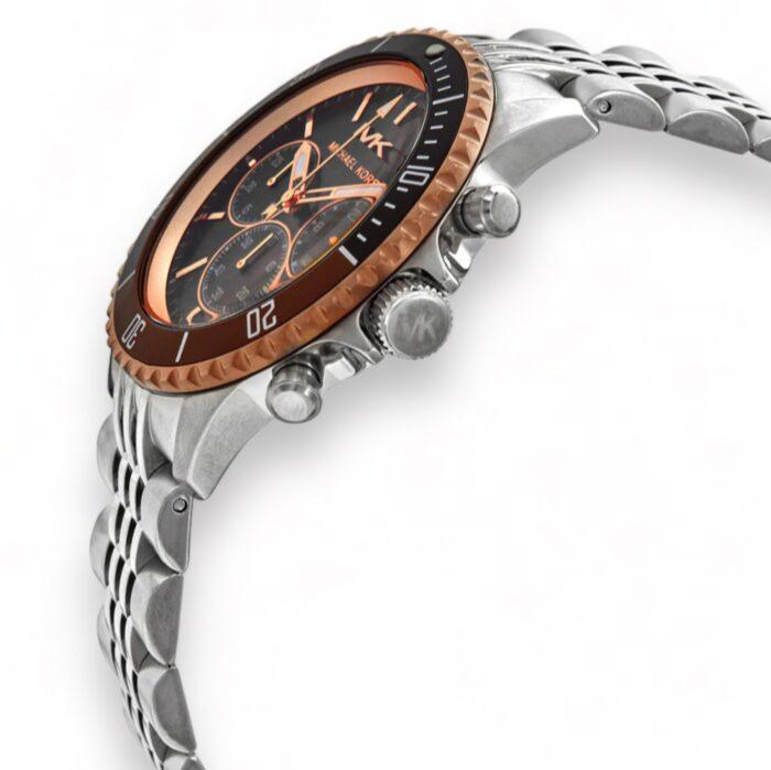 Michael Kors Men's Bayville 44x50mm watch features a black sunray dial with silver-tone stick indexes and numerals, chronograph movement and Steel bracelet.
