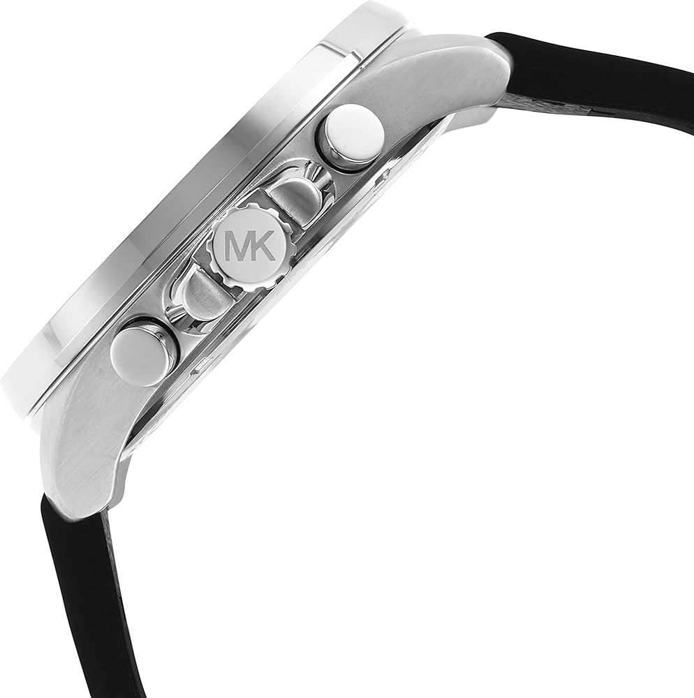 Michael Kors' 45mm Brecken watch features a silver dial with black sub-eyes, silver-tone case, chronograph movement and black silicone strap with gray PVC leather logo inlay.