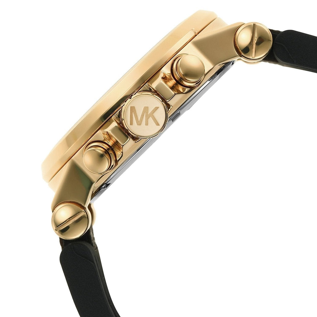 Michael Kors Michael Kors' 48mm Dylan watch features a black dial, gold-tone case, chronograph movement and brown logo-printed silicone strap.