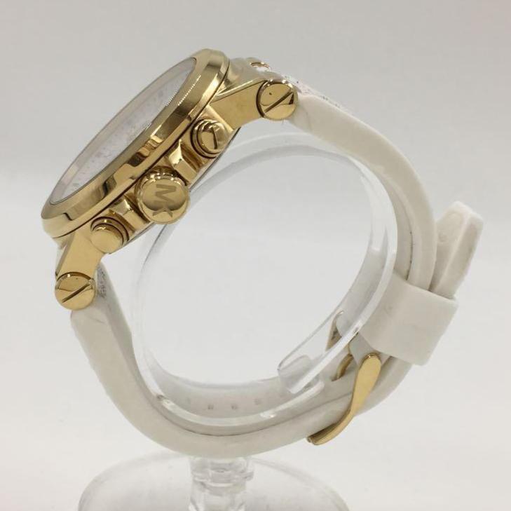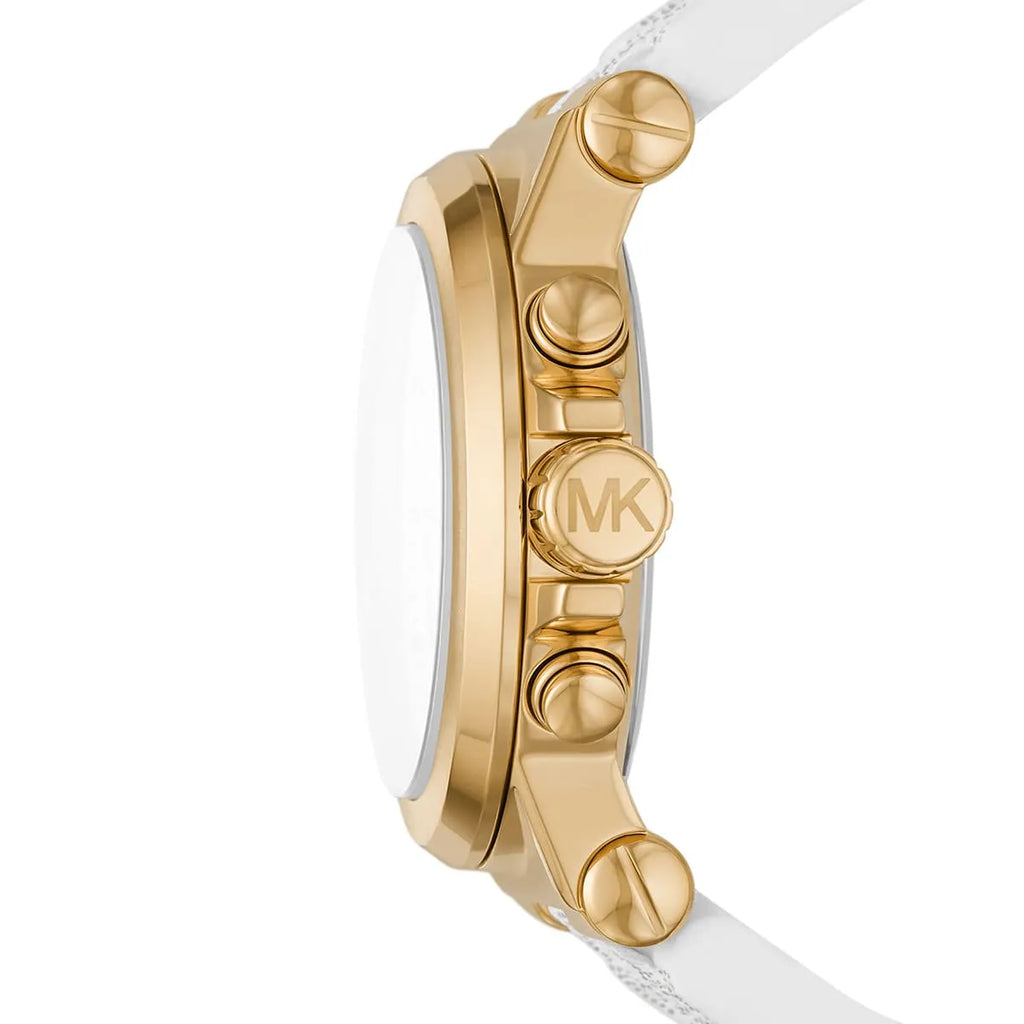 Intricately detailed and stylish, this analog watch from Michael Kors is specially made for the urban men. The gold round dial is protected by a mineral glass. This signature logo pvc print gets an update in optic white inlaid on a white strap on this 48mm watch. Paired back to a gold-tone case, with a white dial, this chronograph sport style watch is made to impress. Besides, it is completed with a buckle clasp to ensure a secure fit on the wrist.