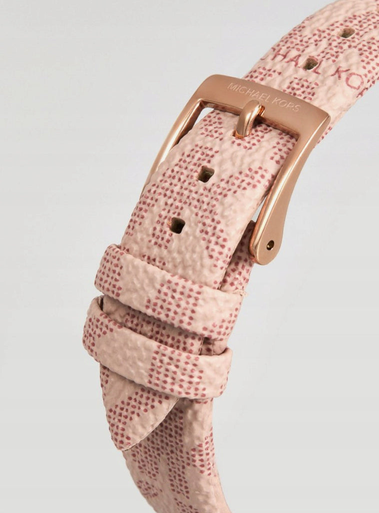 Michael Kors Jayne 38mm watch features a rose gold-tone dial with rose gold-tone stick and glitz indexes, three-hand movement and blush logo-print strap.