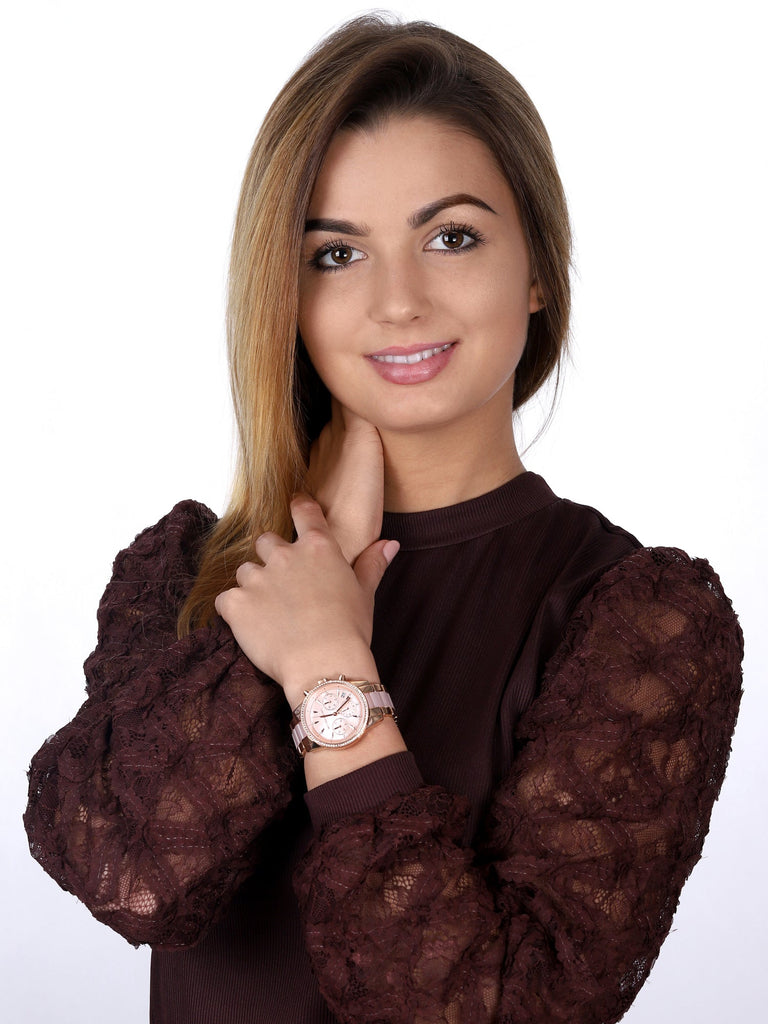 This Michael Kors Ritz MK6769 watch has a rose gold coloured round (stainless) steel case and is even more adorned with zirconia's around the timepiece. The diameter of the watch is 37 mm. The rose gold and pink coloured (stainless) steel combined with plastic strap has a width of 18 mm. The watch is equipped with a quartz movement with a chronograph function with which you can record times, a date indication, 24 hour function, mineral glass and a water resistance of 5 ATM.