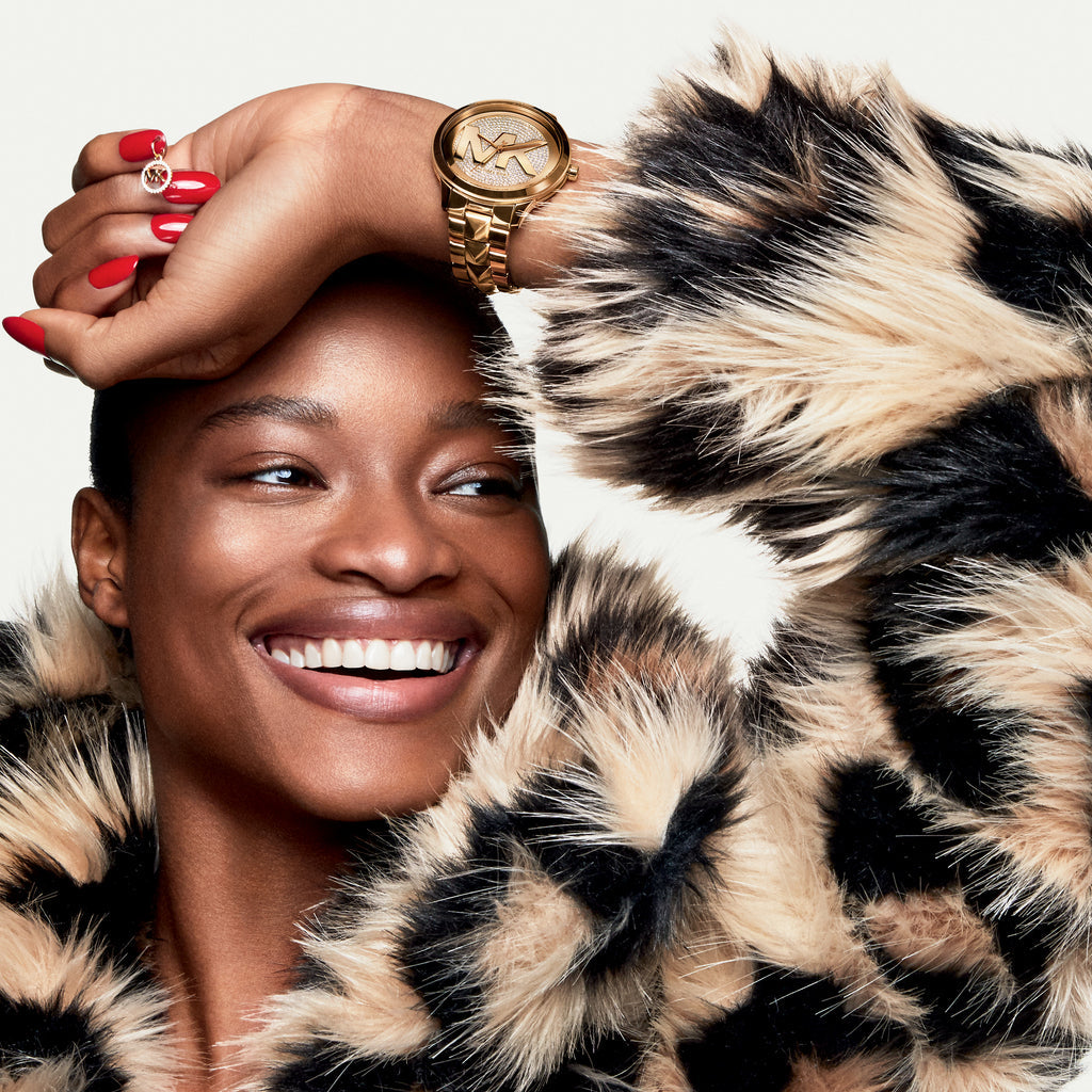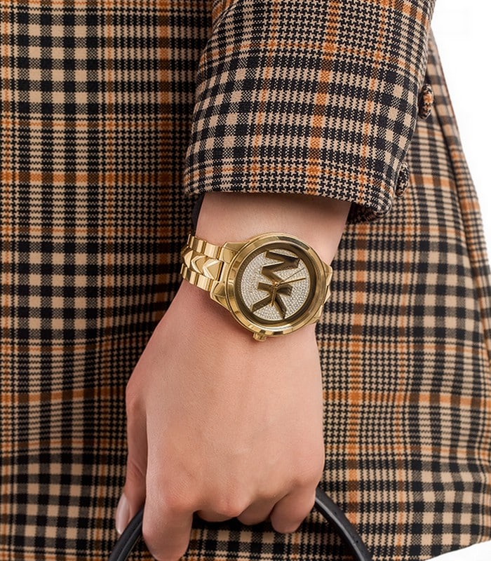 Who doesn’t love a classic with a twist. This timepiece named after a very famous street in SOHO, New York delivers high fashion with the MK logo on the glitzy dial and spikes in the center link of its otherwise classic men's wear inspired gold toned strap. Whether you slip it on solo or with a chic stack of bangles, the result is timeless. This 44x50mm Runway Mercer watch features an all-over glitz dial with gold-tone MK logo and hands, three-hand movement and gold-tone stainless steel bracelet.