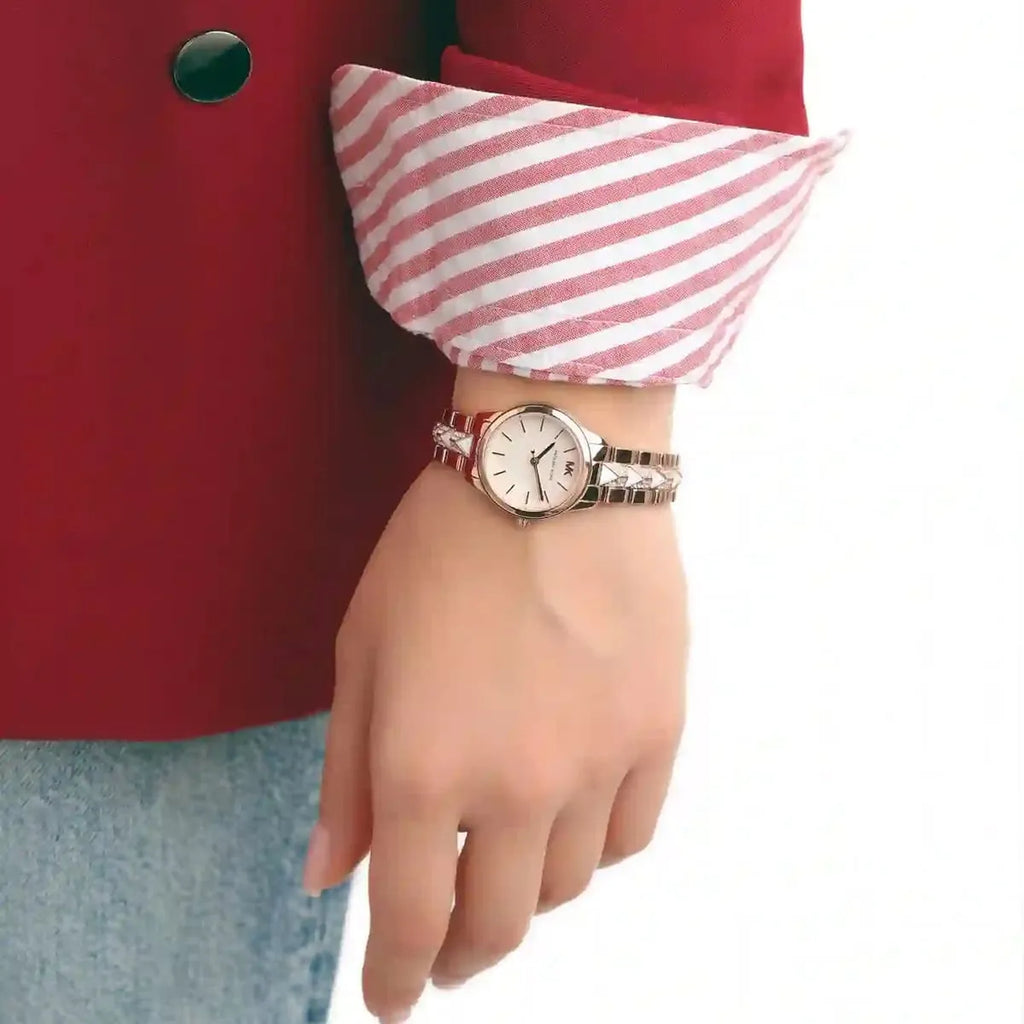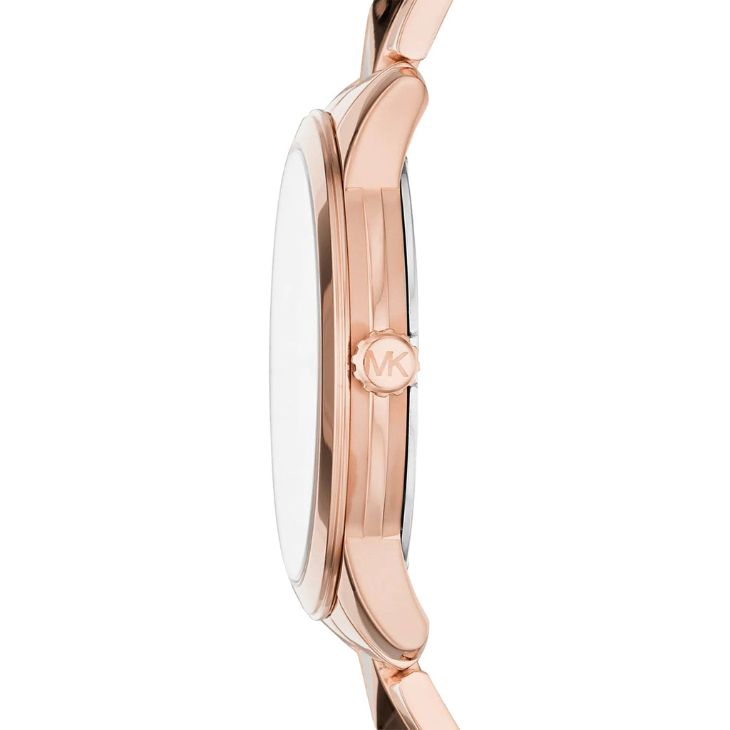 This 28mm Runway watch features a white mother-of-pearl dial with rose gold-tone stick indexes, three-hand movement and rose gold-tone stainless steel bracelet with mother-of-pearl and glitz center-links.