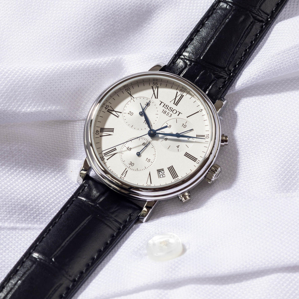 Expertly crafted for the modern man, the Tissot Carson Premium Chronograph watch features a sleek silver dial and black leather strap. With precision chronograph movement and water resistance up to 50 meters, this timepiece is perfect for everyday wear and active lifestyles. Elevate your style with Tissot.