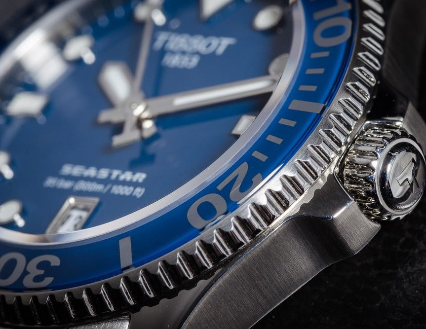 Solid case back. Round case shape. Case size: 36 mm. Case thickness: 9.7 mm. Band width: 18 mm. Fold over clasp with a safety release. Water resistant at 300 meters / 1000 feet. Functions: date, hour, minute, second. Seastar 1000 Series. Dive watch style. Watch label: Swiss Made. Tissot Seastar 1000 Quartz Blue Dial Ladies Watch T1202101104100.