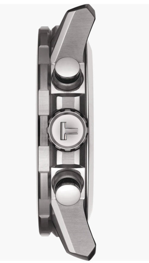 From Tissot's T-Sport collection, a dynamic design crafted with a hard wearing stainless steel case featuring an aluminum bezel, black coloured chronograph dial with Superluminova hands and indexes which are protected by a scratch resistant Sapphire Crystal glass. Additionally this model is powered by a Swiss quartz movement, features date display, stopwatch functionality and finished with a black leather strap which complements it perfectly.