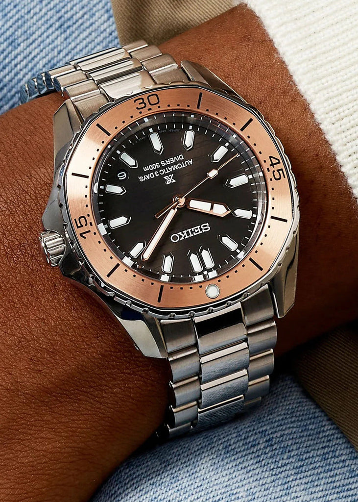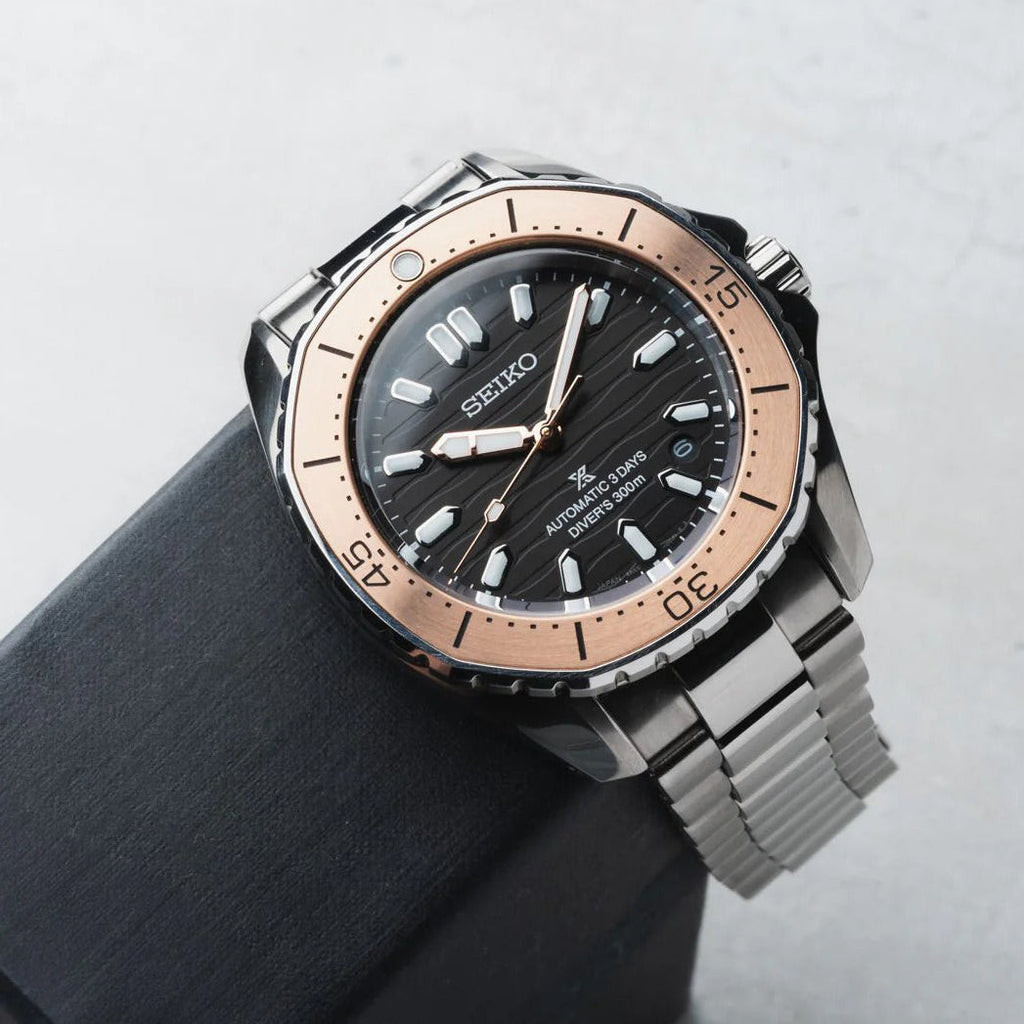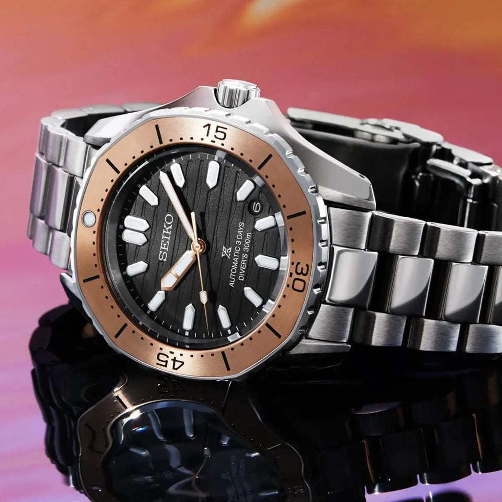 This versatile timepiece blends rugged sports functionality with elegant dress watch aesthetics, perfect for any occasion. Its ocean-grey dial, featuring a tranquil coastline pattern, is protected by a scratch-resistant sapphire crystal. The bronze-toned bezel provides modern appeal and ergonomic handling. With Lumibrite-treated markers, 300m water resistance, and Seiko’s 6R55 automatic movement offering a 72-hour power reserve, it excels in performance.
