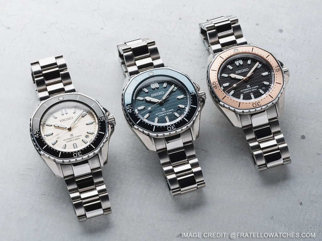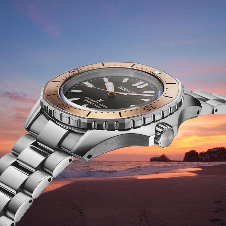 The Seiko Prospex SPB481/483 and 485 watches are fully functional, solid, 30 ATM diving watches with a twist; Their look is less utilitarian, but more leasurely. The dial pattern and colors are inspired by a coastal scene: sand dunes, waves rippling, and the sunlight light playing hide and seek with the clouds. The case and bracelet have an elegant luster with wide, mirrored surfaces.