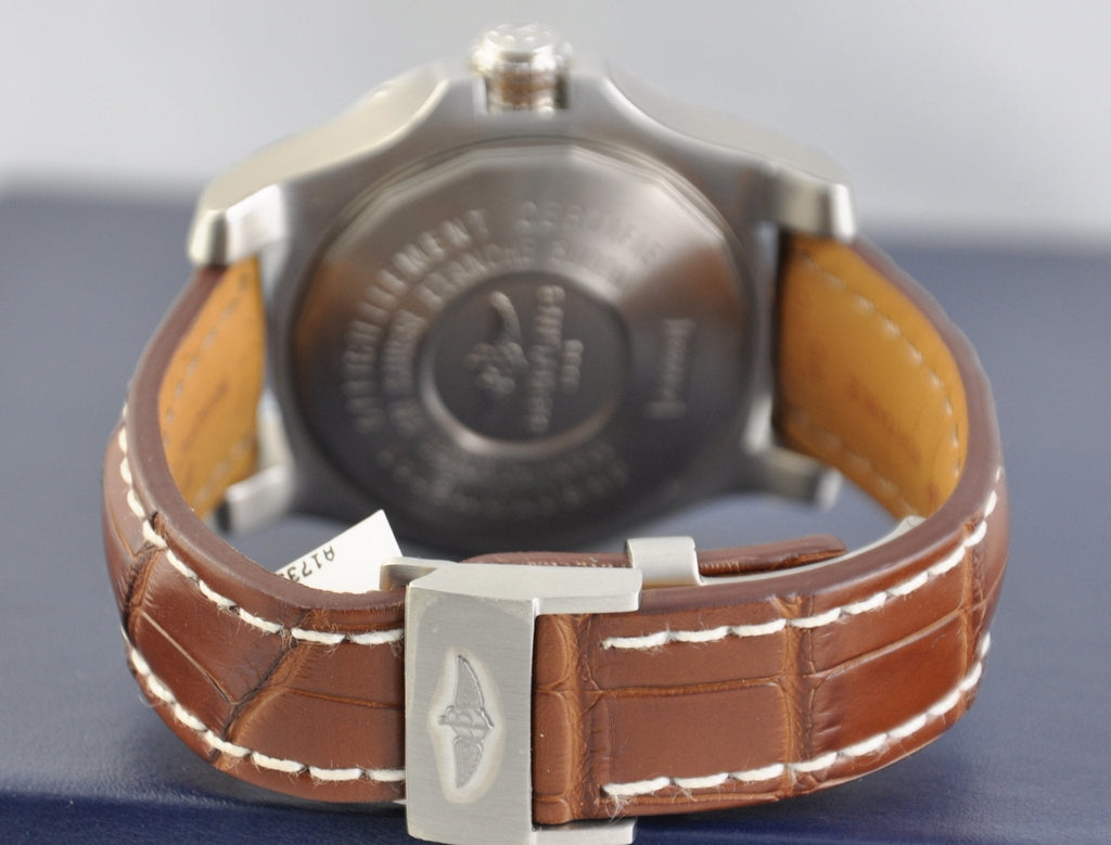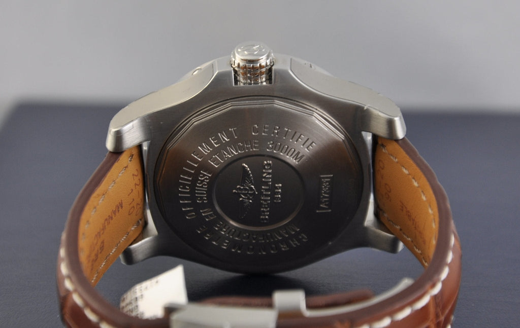 The Breitling Avenger II Seawolf watch pairs a powerful look with exceptional performances. The case is water-resistant to the depth of 3,000 m (10,000 ft) and equipped with a unidirectional rotating bezel, a screw-lock crown with a non-slip grip and a helium valve serving to equal out pressure differences between the inside and the outside of the watch. It is powered by the COSC-certified self-winding caliber B17.