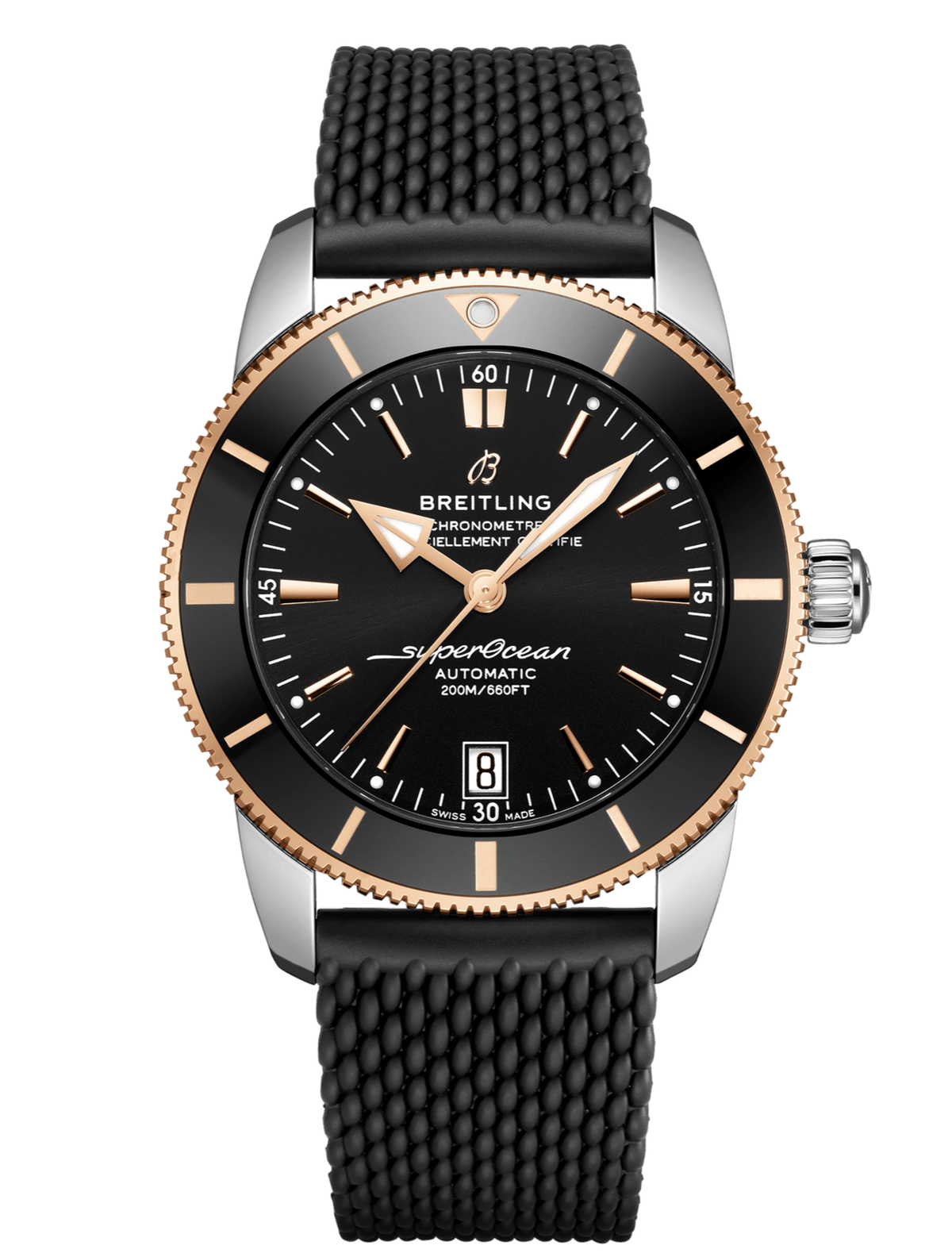 Breitling Superocean Heritage II 42mm watch. Model reference: UB2010121B1S1. The stylish timepiece has been designed to meet the professional needs of military divers in deep waters. Its rounded 42mm case of 14.35mm thickness is made of polished stainless steel and features a unidirectional rotating bezel of rose gold and black ceramic. The black dial has applied indexes and stylized hands with luminous fill for hour and minute marking. The thin hand serves for seconds tracking. The big date window is placed at the 6 o’clock. The B20 mechanical movement is wound automatically. It contains 28 jewels and features 70-hour power reserve. The strap is made of black rubber and fitted with a deployant buckle. It is water resistant up to 200m.
