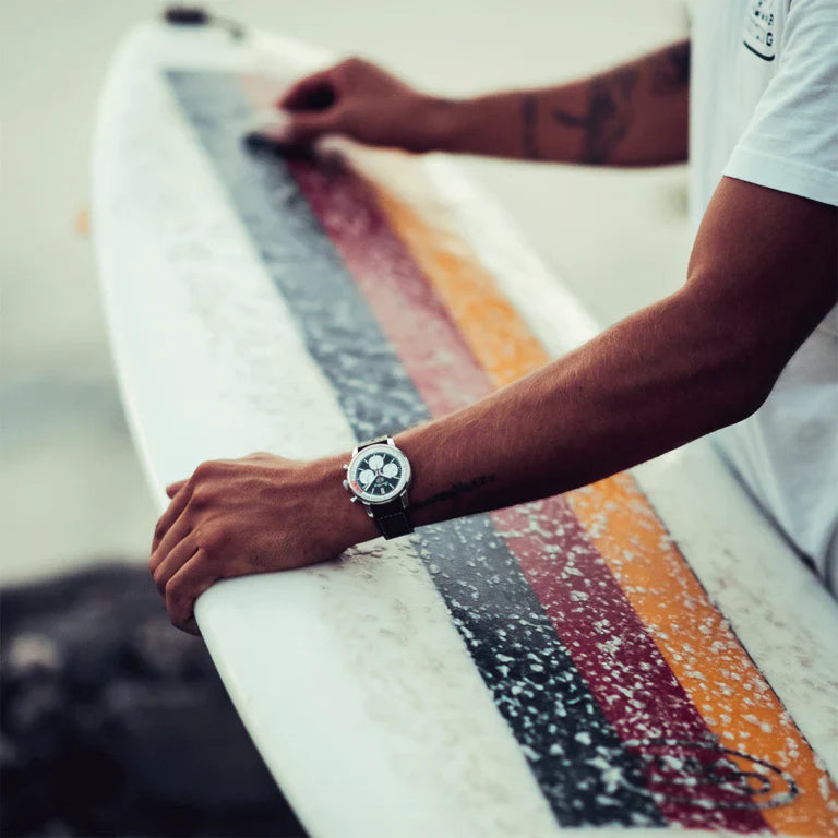 The 1960s was a decade of experimentation, fun, freedom and energy. Whether cruising on a motorcycle or revving up a sportscar, living life at full speed was the order of the day. Willy Breitling felt this change of pace and set out to design an unconventional chronograph that would capture the verve of era. He called it the Top Time. That spirited tradition continues today with Breitling partnering with some of the coolest names in wheels to create its Top Time designs. Co-designed with Australian surf-and-motorcycle outfitter Deus Ex Machina, the Top Time B01 Deus will appeal to bikers, boarders and backpackers, all looking for the freedom to explore the world their own way, at their own pace. It features the Deus emblem and adage “In benzin veritas” on the dial as well a perforated leather racing strap, speed-measuring tachymeter scale and contrasting “squircle” (not quite square, not quite round) subdials that give the feel of a vintage dashboard gauge. It also comes with a special lightning-bolt-shaped chronograph hand and, under the hood, a brag-worthy engine: the exceptional Breitling Manufacture Caliber 01.