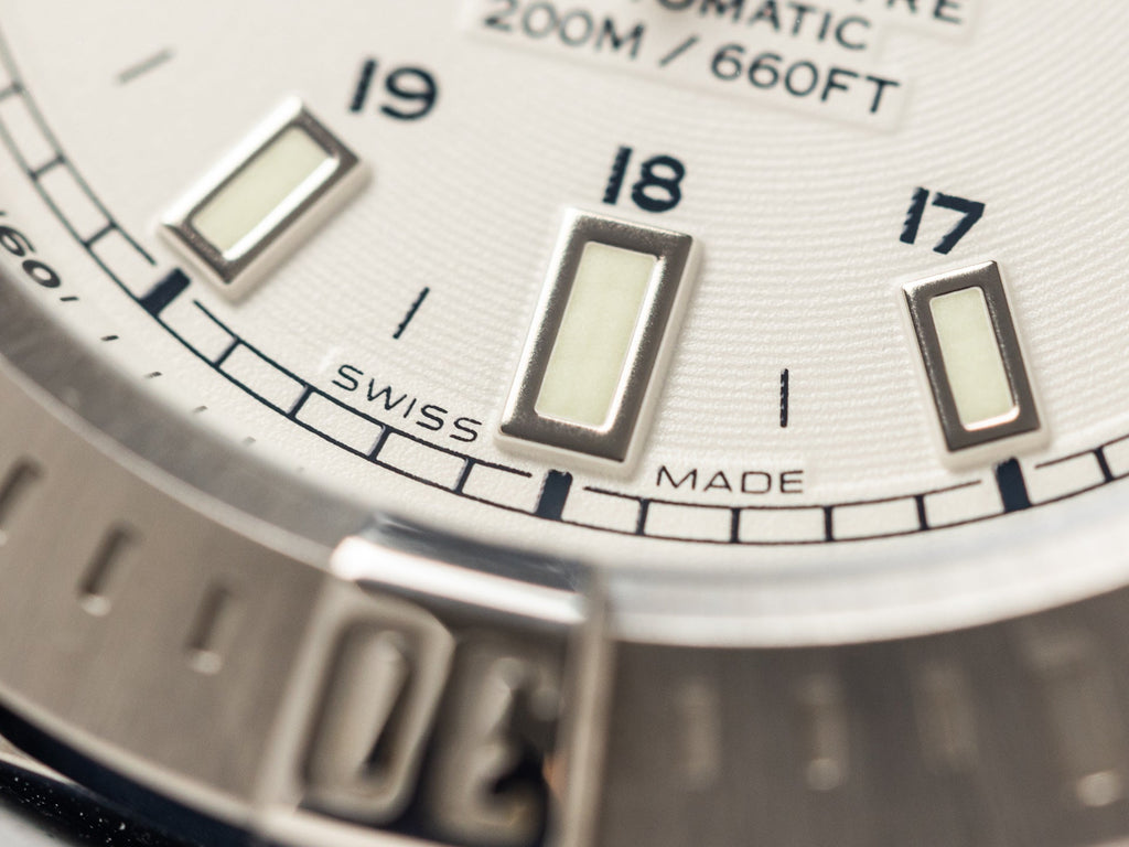 - Mariner Blue dial with a very fine concentric circle pattern texture.
