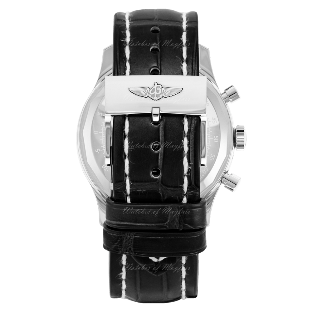 Date display at the 3 o'clock position. Chronograph - three sub-dials displaying: 60 seconds, 30 minutes, and 12 hours. Breitling calibre 13 automatic movement, based upon ETA Valjoux 7750, containing 25 Jewels, bitting at 28800 vph, and has a power reserve of approximately 42 hours. Scratch resistant sapphire crystal. Pull / push crown. Solid case back. Round case shape. Case size: 41 mm. Case thickness: 14.44 mm. Band width: 22 mm, band length: 7 inches. Tang clasp. Water resistant at 30 meters / 100 feet. Functions: chronograph, date, hour, minute, second, chronometer.