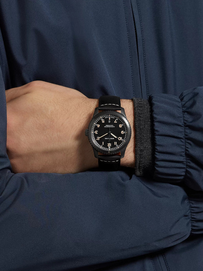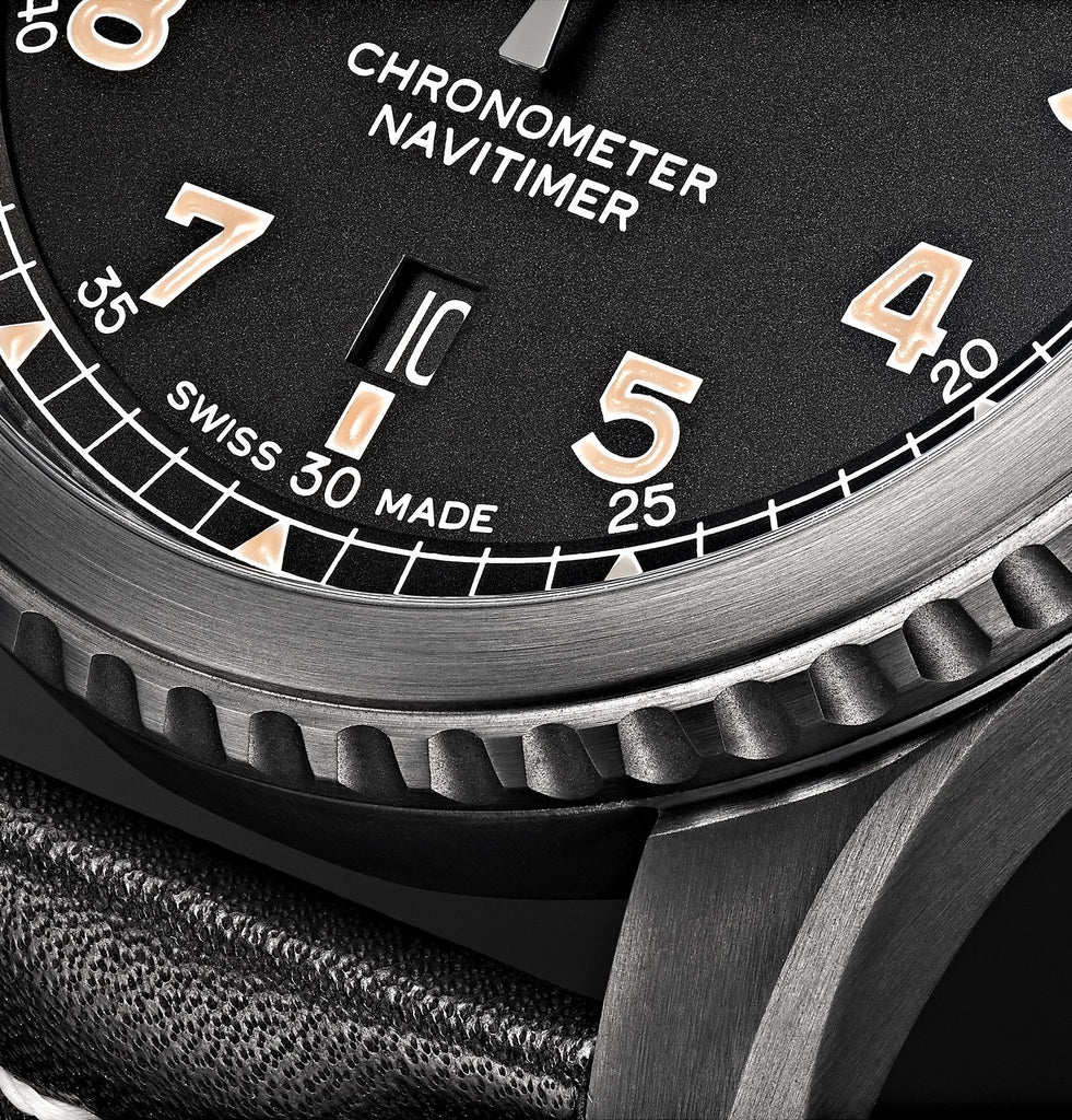 Breitling Navitimer 8 (M17314101B1X1) self-winding automatic watch, features a 41mm Blacksteel case surrounding a black dial on a black leather strap with a Blacksteel tang buckle. Functions include hours, minutes, seconds and date. This watch comes complete with box and papers. M