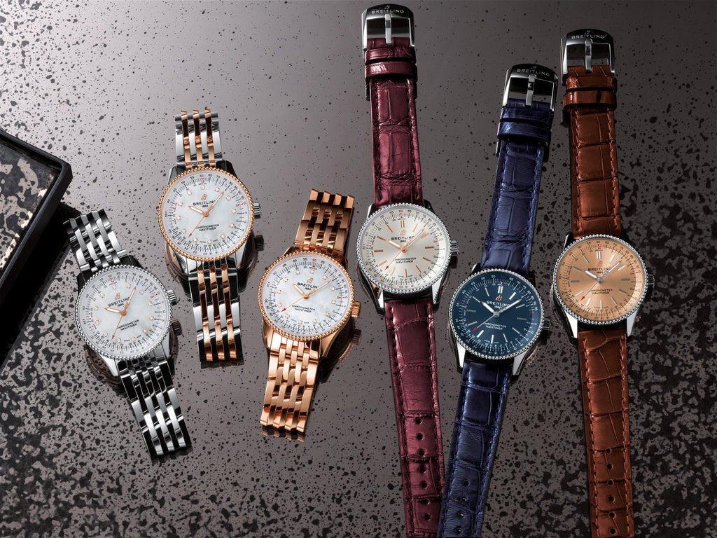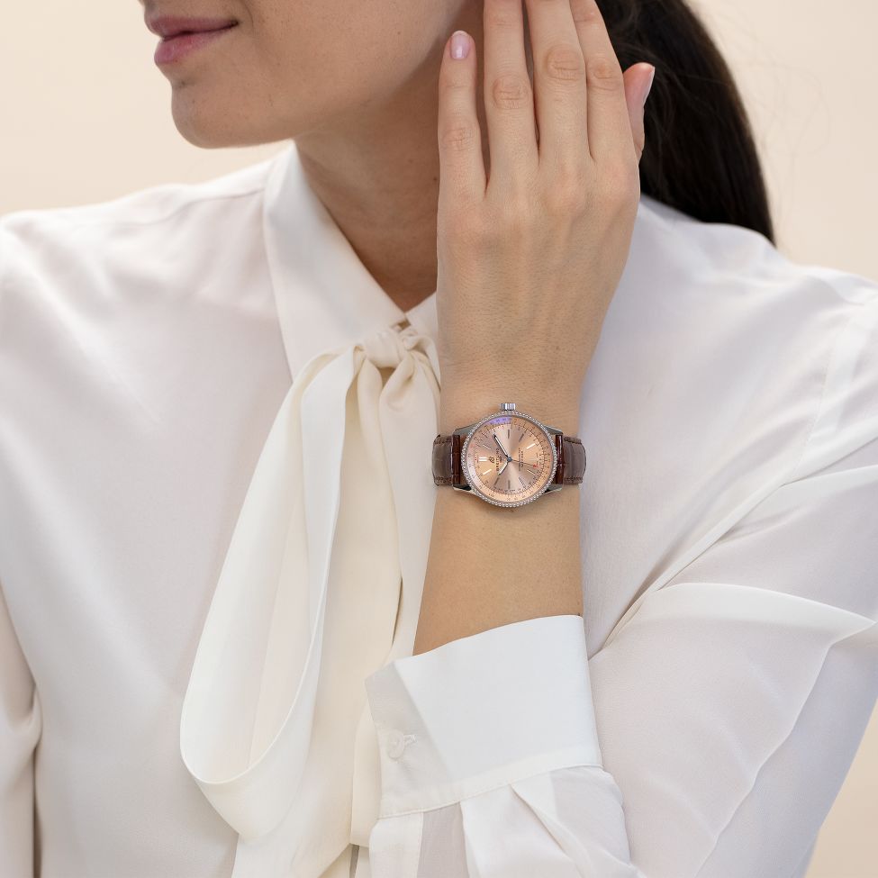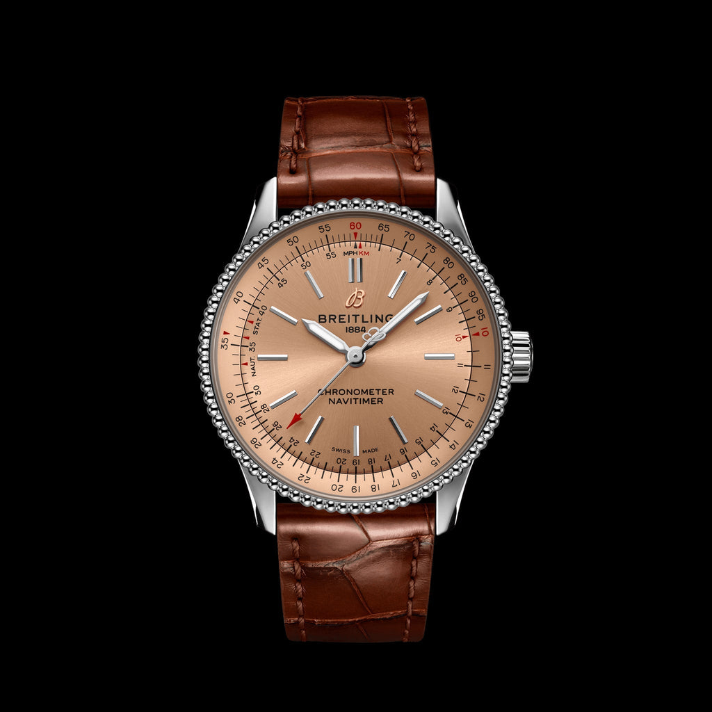 Refined and elegant, the Navitimer Automatic 35 combines the historic appeal of a true icon with the sophistication of a contemporary timepiece. Available in a variety of materials including stainless steel and 18k red gold, the 35 mm case features a beaded bezel and a range of elegant dial colors, as well as diamond-set white mother of pearl. Offered either with a matching bracelet or alligator strap that fits both a stainless steel pin or folding buckle, the Navitimer Automatic 35 is powered by the Breitling Caliber 17, a COSC-certified chronometer.