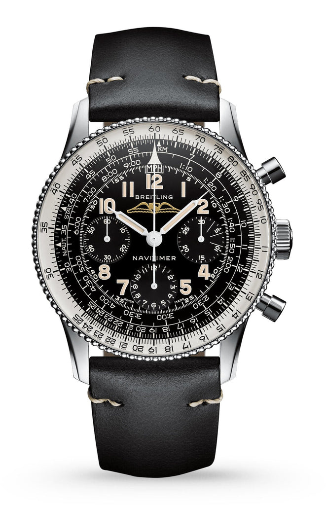 The Navitimer Ref. 806 1959 Re-Edition has been designed with painstaking attention to every detail to faithfully match the design of the original Navitimer in 1959. It has a stainless-steel case of precisely the same dimensions as its inspiration and an all-black dial with tone-on-tone small second, 30-minute and 12-hour chronograph counters. Recreating one of the signature elements of the original Navitimer Ref. 806 in 1959, the dial, protected by a highly-domed Plexiglas, is highlighted with a Breitling inscription in capital letters and an unsigned winged logo. In fact, the only concessions to modernity are the water resistance, which has been increased to 3 bar (30 meters), and a Super-LumiNova® coating for which a very special attention has been paid to the color to ensure that it aligns with the aging of the luminescent material on earlier watches. Its hand-finished application gives the dial an additional touch of vintage allure and all its character.