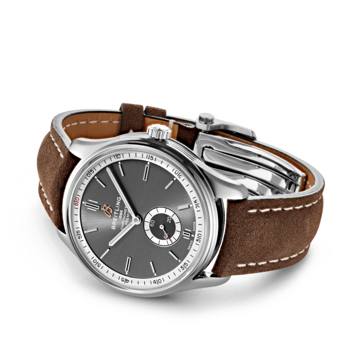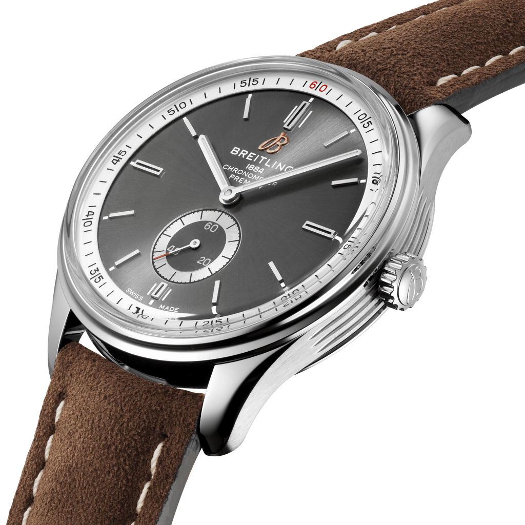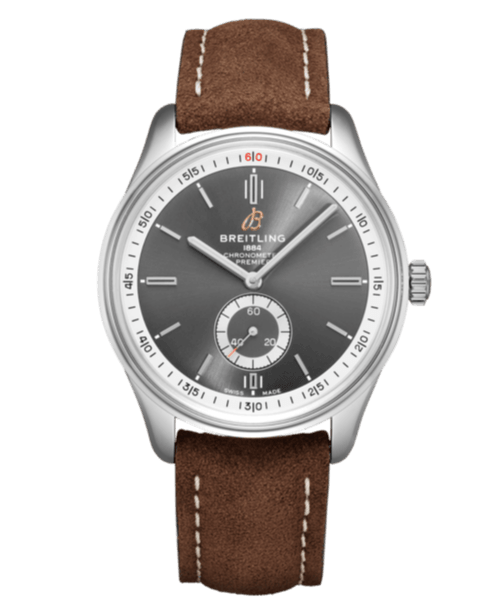 Stainless steel case with a brown (nubuck) leather strap. Fixed stainless steel bezel. Anthracite dial with luminous silver-tone hands and index hour markers. Minute markers around the outer rim. Dial Type: Analog. Luminescent hands and markers. Small second sub-dial. Breitling calibre 37 automatic movement, based upon ETA 2895-2, containing 27 Jewels, bitting at 28800 vph, and has a power reserve of approximately 42 hours. Scratch resistant sapphire crystal. Screw down crown. Solid case back. Round case shape. Case size: 40 mm. Case thickness: 11.40 mm. Band width: 20 mm / 18 mm. Tang clasp. Water resistant at 100 meters / 330 feet. Functions: hour, minute, second. Luxury watch style. Watch label: Swiss Made. Breitling Premier Automatic Anthracite Dial Men's Watch A37340351B1X1.