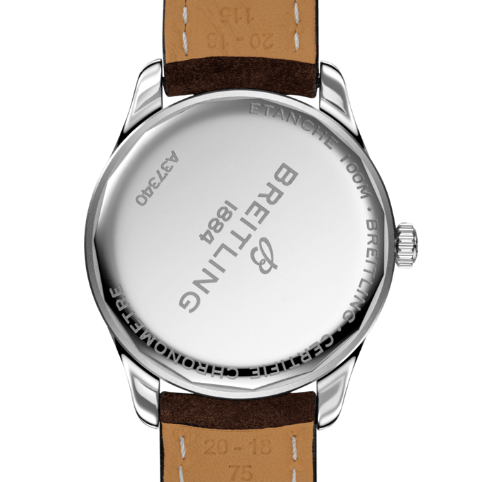 Anthracite dial enhanced by luminous silver-tone hands. Silver-tone stainless steel case with a brown (nubuck) leather band. Automatic movement. 100 meters / 330 feet water resistance. Fixed bezel. Scratch Resistant Sapphire crystal. Solid caseback. Tang clasp. Screw Down crown. Case size 40 mm x 11.40 mm. Band 20 mm / 18 mm x long. Breitling A37340351B1X1 Premier Watch.