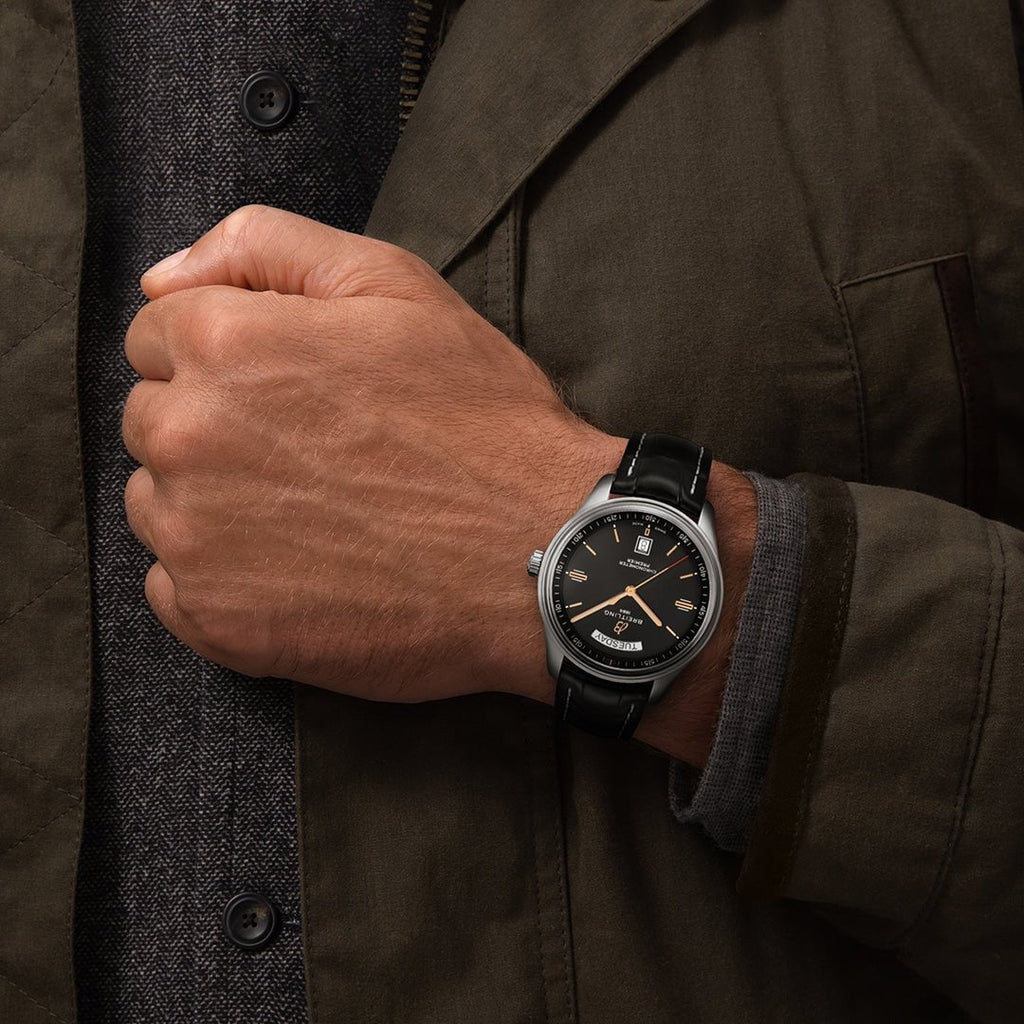 Stainless steel case with a black (crocodile) leather strap. Fixed stainless steel bezel. Black dial with luminous rose gold-tone hands and index hour markers. Arabic numeral minute markers (at 5 minute intervalsd). Minute markers around the outer rim. Dial Type: Analog. Luminescent hands and markers. Date display at the 6 o'clock position. Day of the week display centered on the 12 o'clock position. Breitling calibre 45 automatic movement, based upon ETA 2834-2, containing 25 Jewels, bitting at 28800 vph, and has a power reserve of approximately 42 hours. Scratch resistant sapphire crystal. Pull / push crown. Solid case back. Round case shape, case size: 40 mm. Case thickness: 11.40 mm. Band width: 20 mm. Deployment clasp with a push button release. Water resistant at 100 meters / 330 feet. Functions: date, day, hour, minute, second, chronometer. Premier Series. Luxury watch style. Watch label: Swiss Made. Breitling Premier Automatic Chronometer Black Dial Men's Watch A45340241B1P1.