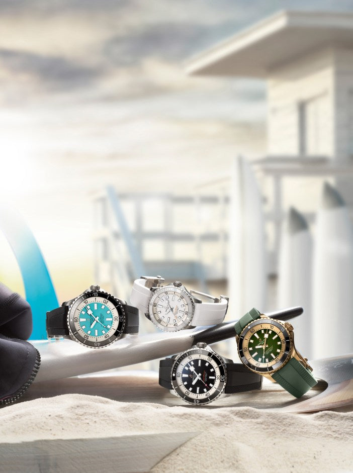 The new Superocean retraces the Slow Motion's celebrated design codes, while adding modern features, like a ceramic-inlayed bezel and brightly colored dials. Broad hands and indexes in luminescent Super-LumiNova® allow for easy readability underwater. The watch is water resistant to 300 m (1000 ft), as well as being shock-, sand- and saltwater-resistant. The bronze version uses a special alloy that has excellent resistance to corrosion, yet will still develop a subtle patina over time that makes the watch even more unique. The two strap options (rubber and metal bracelet) have a folding clasp that allows for micro-adjustments of up to 15 mm for easy wear over rashies and wetsuits. Its scratch-proof ceramic inlayed bezel will never wear or fade. For safety, the bezel is uni-directional on most sizes and bi-directional with a patented lock on the 46 mm. Best of all, this is no longer strictly a dive watch—surf with it, swim with it, hit the beach bar with it, then wear it out to dinner. The Superocean perfectly balances the nostalgia of its heritage with a fresh new look.