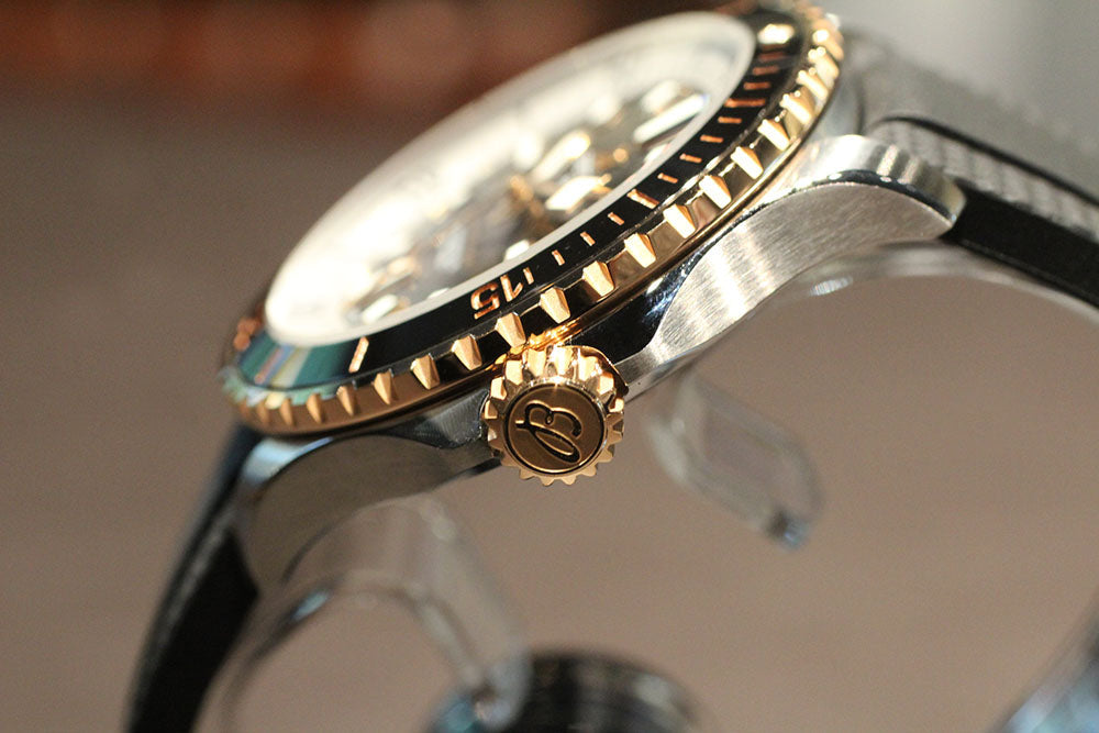 The new Superocean retraces the Slow Motion's celebrated design codes, while adding modern features, like a ceramic-inlayed bezel and brightly colored dials. Broad hands and indexes in luminescent Super-LumiNova® allow for easy readability underwater. The watch is water resistant to 300 m (1000 ft), as well as being shock-, sand- and saltwater-resistant. The bronze version uses a special alloy that has excellent resistance to corrosion, yet will still develop a subtle patina over time that makes the watch even more unique. The two strap options (rubber and metal bracelet) have a folding clasp that allows for micro-adjustments of up to 15 mm for easy wear over rashies and wetsuits. Its scratch-proof ceramic inlayed bezel will never wear or fade. For safety, the bezel is uni-directional on most sizes and bi-directional with a patented lock on the 46 mm.