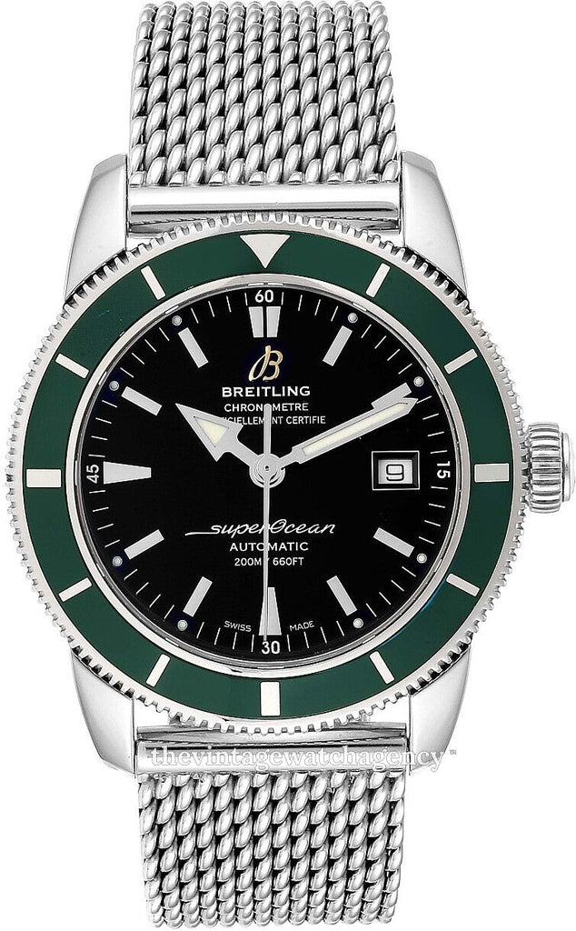 Breitling Superocean Heritage 42 A1732136-BA61-154A - Swiss Made, Volcano Black Dial, Green Bezel ,Date Feature, 40 Hour Power Reserve, Self-winding Automatic Chronometer Movement, Breitling Caliber 17, Vibrations Per Hour: 28,800, Jewels: 25, Polished Stainless Steel Case, Ocean Classic Bracelet, Scratch Resistant Glareproof Sapphire Crystal, 200 Meters / 660 Feet Water-Resistant, 42mm = 1 5/8" Case, 7" Adjustable Bracelet, Case Weight: 86.65g, Case Thickness: 12.95mm, Inlet Size: 22mm, Unidirectional Rotating Bezel, Luminescent Hands & Hour Markers, Screw Down Crown & Case Back, Deployment Buckle, Free Bracelet Sizing