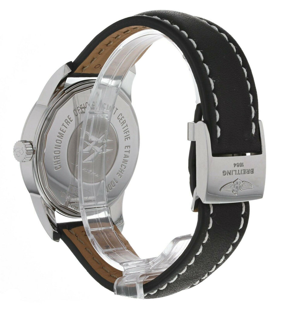 Stainless steel case with a black leather strap. Fixed stainless steel bezel. Black dial with luminous silver-tone hands and index hour markers. Minute markers around the outer rim. Dial Type: Analog. Luminescent hands and markers. Date display at the 3 o'clock position. Day of the week display at the 12 o'clock position. Automatic movement with a 42 hour power reserve. Scratch resistant sapphire crystal. Pull / push crown. Solid case back. Case diameter: 43 mm. Case thickness: 12.8 mm. Round case shape. Band width: 22 mm / 20 mm. Deployment clasp. Water resistant at 100 meters / 330 feet. Functions: date, day, hour, minute, second. Luxury watch style. Watch label: Swiss Made. Item Variations: Breitling TransOcean Day Date Automatic Black Dial Black Leather Men's Watch A4531012