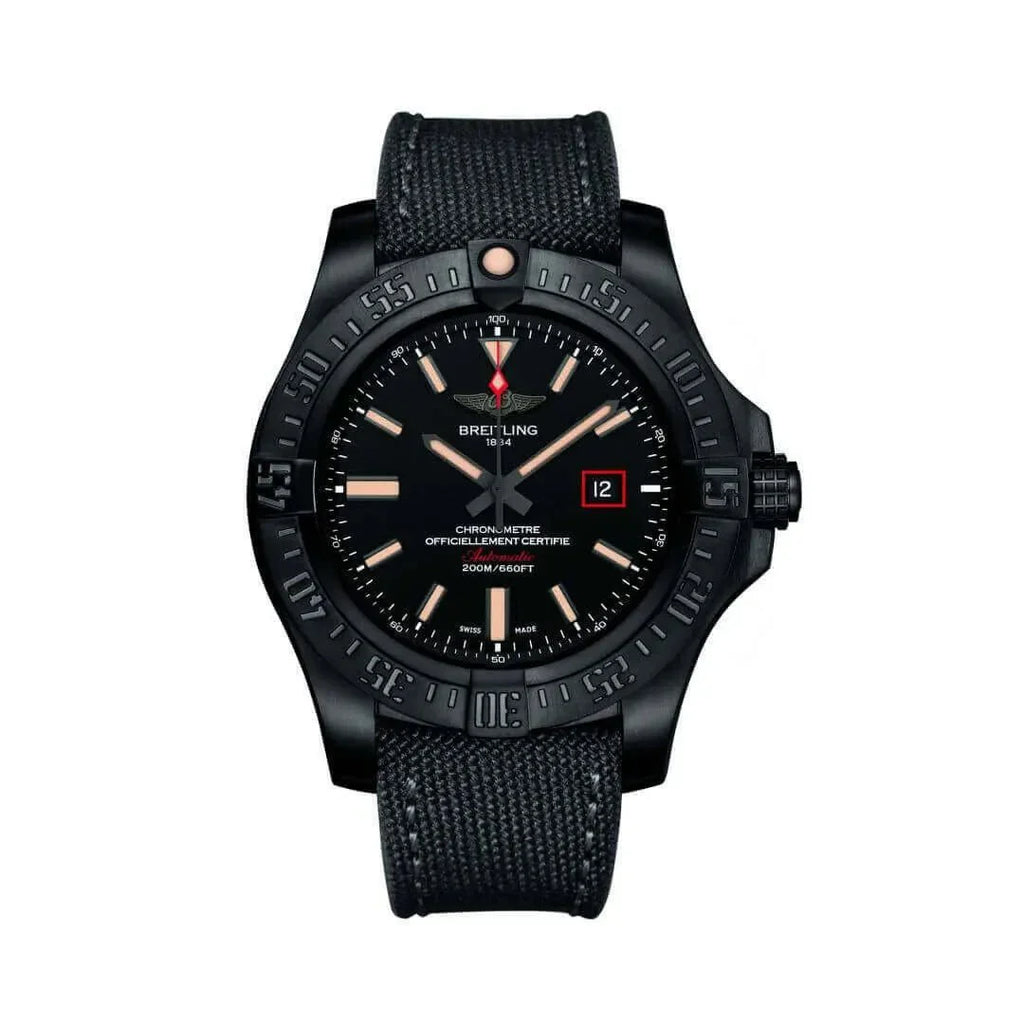 The high-performance, accurate and functional Avenger Blackbird, available in 44 mm and 48 mm, embodies a concentrated blend of the Breitling spirit. Its watchword is “power in action”. The light and sturdy titanium case features a highly resistant black carbon-based treatment, resulting in a “stealthy” aesthetic accentuated by its satin-brushed appearance. The dial is defined by its excellent readability, while the unidirectional rotating bezel with rider tabs keeps extremely precise count of flight or dive times. This vocation for top flight accomplishments is also reflected in the military-style anthracite strap in an ultra-durable high-tech fabric.