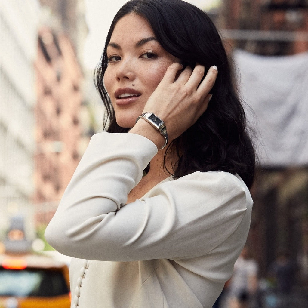 From the Classic Collection. In stainless steel with faceted metallized crystal, rectangular black enamel dial, and adjustable-link bangle bracelet.