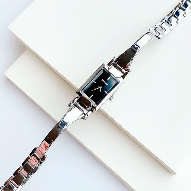 Bulova the Classic Collection. In stainless steel with faceted metallized crystal, rectangular black enamel dial, and adjustable-link bangle bracelet. Water resistance to 30 meters. Case diameter: 19mm.