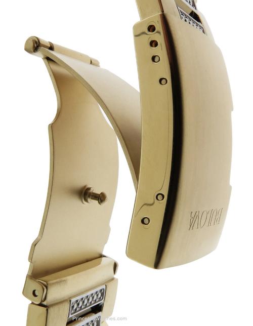 Gold ion-plated stainless steel case with a two-tone (silver-tone and gold ion-plated) stainless steel bracelet. Fixed stainless steel bezel set with crystals. Black bi-level sunray dial with luminous gold-tone hands and crystal-tipped index hour markers. An Arabic numeral appears at the 12 o'clock position. Minute markers. Arabic numeral minute markers (at 5 minute intervals) around the outer rim. Dial Type: Analog. Luminescent hands and markers.