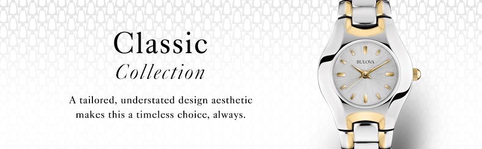 For every wearing occasion from sport to casual professional to dress Bulova's signature brand delivers exceptional design and style enhanced by technology. Paced by its exquisitely crafted diamond watches meticulously engineered self-winding mechanicals and the innovative architectural lines within the high-performance Marine Star collection Bulova's diverse selection encompasses classic and contemporary styling and technology. Bulova Ladies Bracelet Watch White Dial Two Tone Stainless Steel Case and Bracelet Curved crystal with metalized rim Water resistant to 30 meters/100feet Two-Year Limited from Bulova- SKU: BUL688