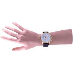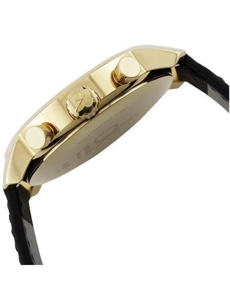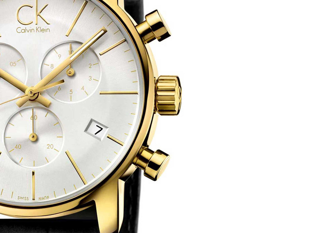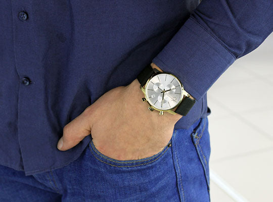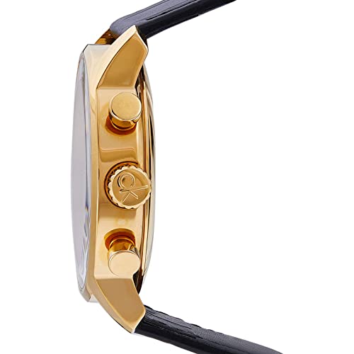 Gold-tone stainless steel case with a black leather strap. Fixed gold-tone stainless steel bezel. Silver dial with gold-tone hands and index hour markers. Dial Type: Analog. Luminescent hands. Date display at the 4 o'clock position. Chronograph - three sub-dials displaying: 60 second, 30 minute and 1/10th of a second. Quartz movement. Scratch resistant mineral crystal. Pull / push crown. Solid case back. Case size: 43 mm. Case thickness: 12 mm. Round case shape. Band width: 20 mm. Water resistant at 50 meters / 165 feet. Functions: chronograph, date, hour, minute, second. Dress watch style. Watch label: Swiss Made. Calvin Klein City Silver Dial Men's Chronograph Watch K2G275C6.