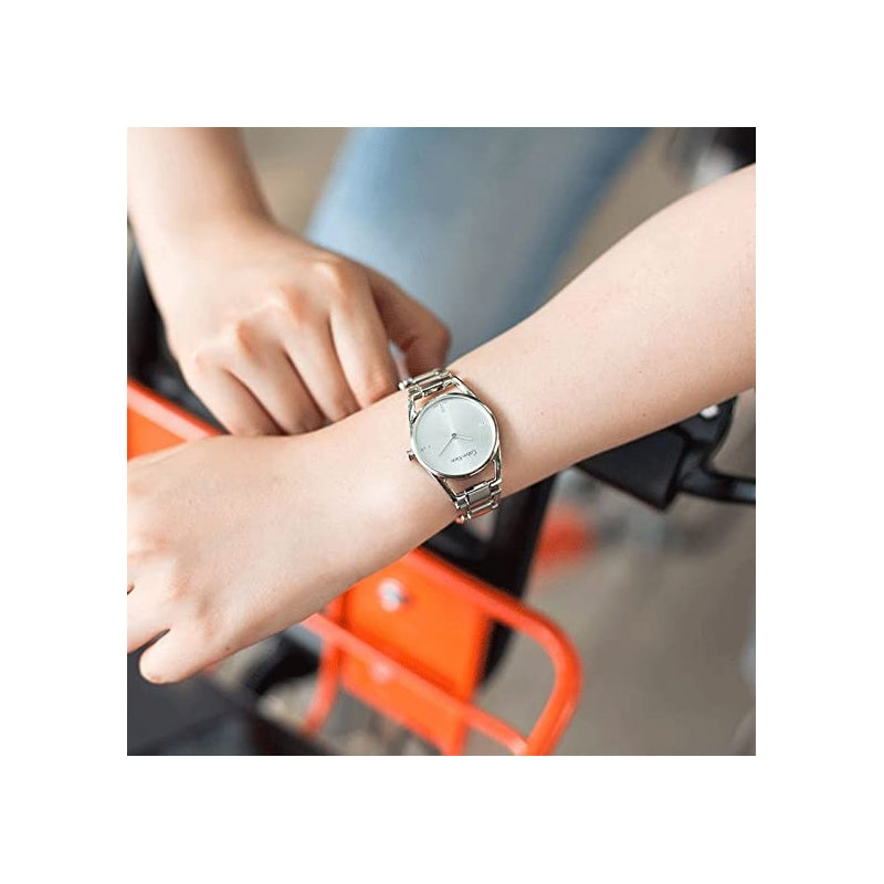 Calvin Klein women’s watch with silver stainless steel bracelet, silver case with a diameter of 30mm and silver dial decorated with 9 distinctive diamonds and mineral crystal. Waterproof for hand washing. It has a two-year warranty on the mechanism.