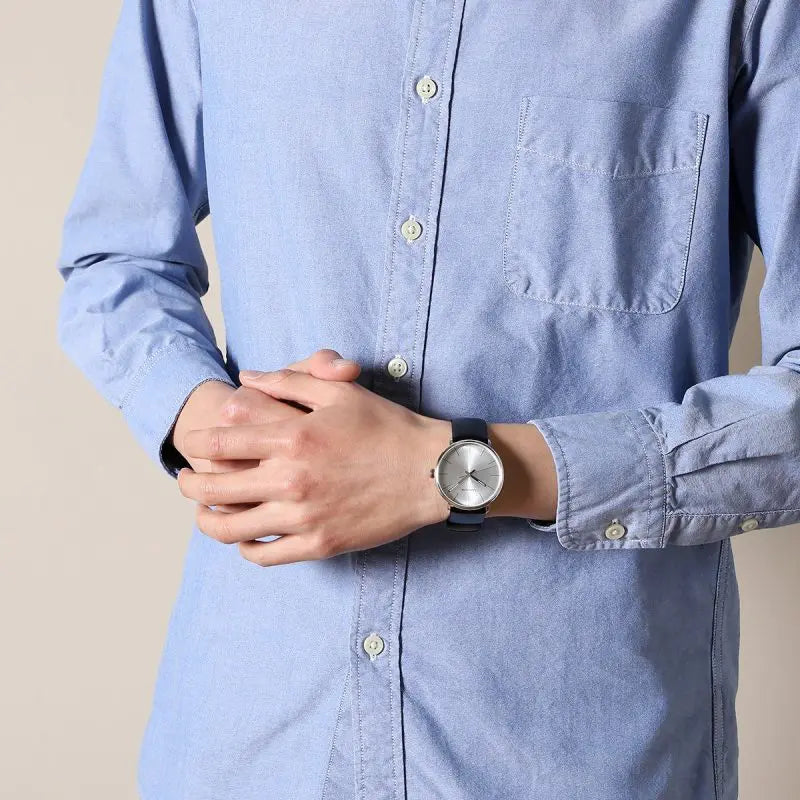 - 40 mm silver stainless steel case. The clock dial is silver and covered with mineral glass. The strap is made of black leather strap. Two hands movement.