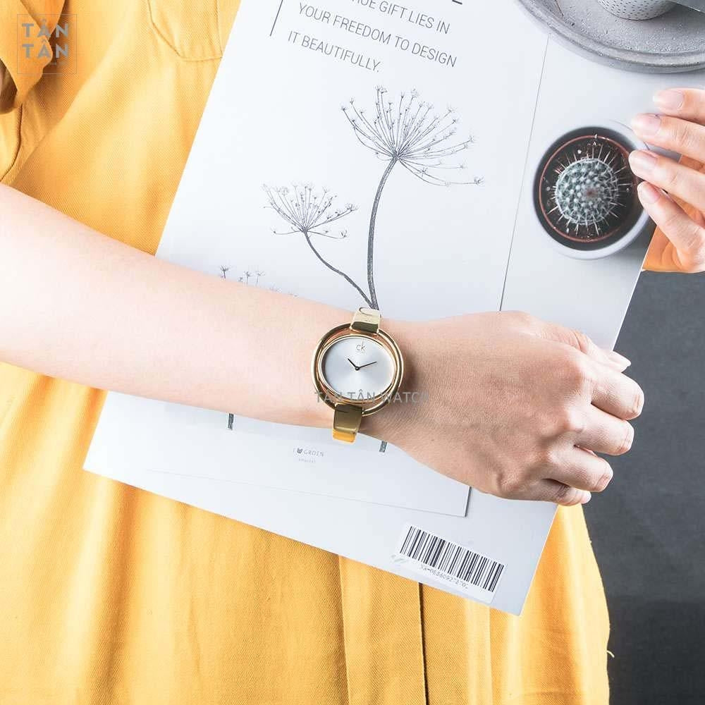 Yellow gold PVD stainless steel case with a yellow gold PVD stainless steel bracelet. Fixed yellow gold PVD bezel. Silver dial with yellow gold-tone hands. No markers. Dial Type: Analog. Quartz movement. Scratch resistant mineral crystal. Pull / push crown. Solid case back. Oval case shape. Case dimensions: 35 mm x 40 mm. Case thickness: 7 mm. Jewelry clasp. Water resistant at 30 meters / 100 feet. Functions: hour, minute. Casual watch style. Watch label: Swiss Made. Calvin Klein Impetuous Quartz Silver Dial Ladies Watch K4F2N516.