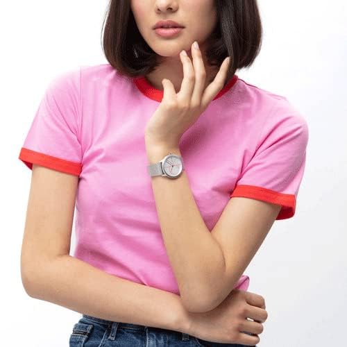 Stainless steel case with a stainless steel mesh bracelet. Fixed stainless steel bezel. White dial with silver-tone hands. No markers. Dial Type: Analog. Quartz movement. Scratch resistant mineral crystal. Pull / push crown. Solid case back. Round case shape. Case size: 35 mm. Case thickness: 7 mm. Band width: 18 mm. Fold over slip through clasp. Water resistant at 30 meters / 100 feet. Functions: hour, minute. Minimal Series. Casual watch style. Watch label: Swiss Made. Calvin Klein Minimal Quartz White Dial Ladies Watch K3M52152.